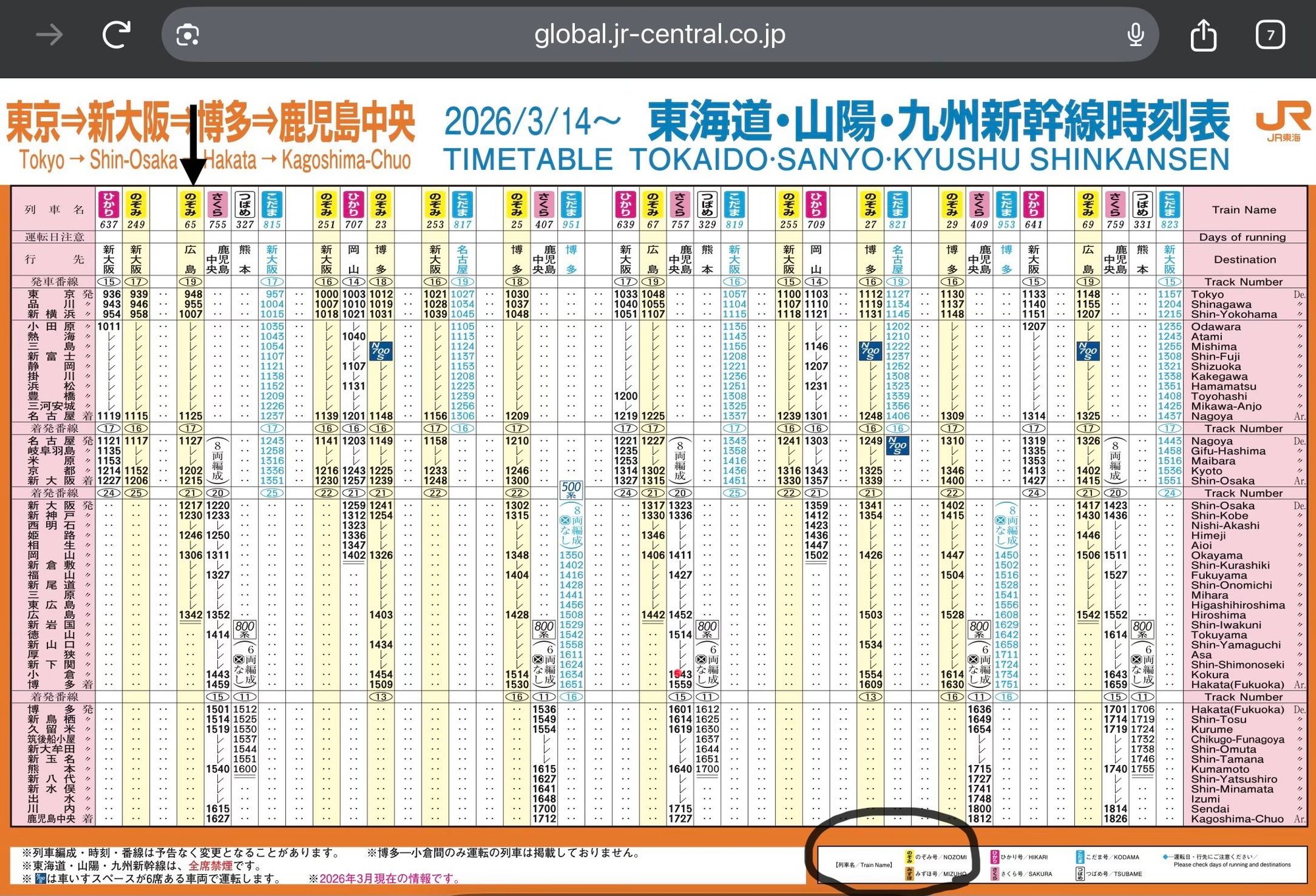 Here’s part of the Shinkansen timetable with your train and explanation of train names and colours marked. See you on April 2!