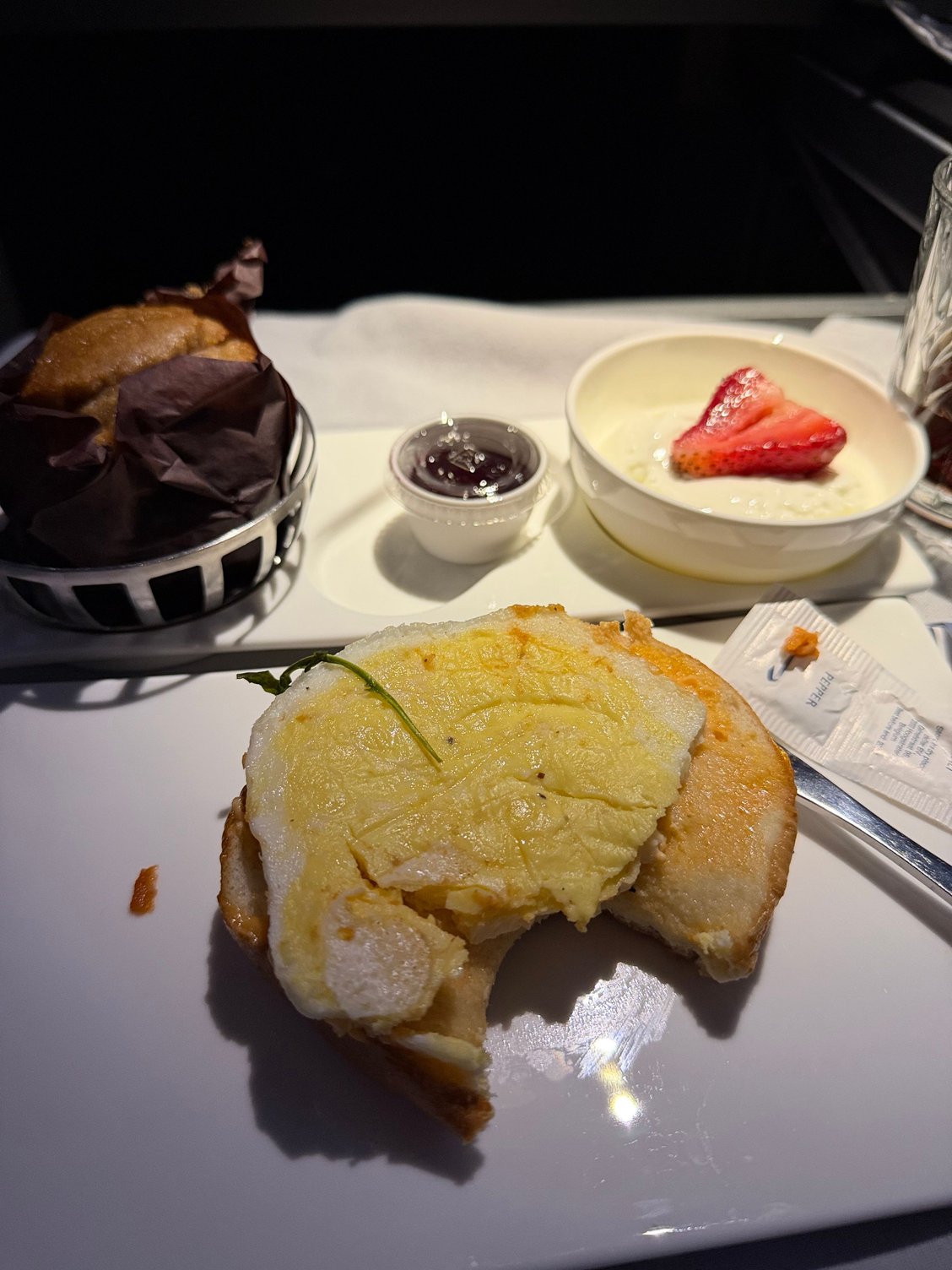 Oh, and breakfast was just terrible as well. No sight of onion bacon jam and the sandwich was almost cold. The egg was a weird pre-processed Sysco thing. Yucky. Worst meal I’ve had on BA or business class for that matter, but at least BA did feed me essentially 4 times on a DEN-LHR-LIS itinerary.