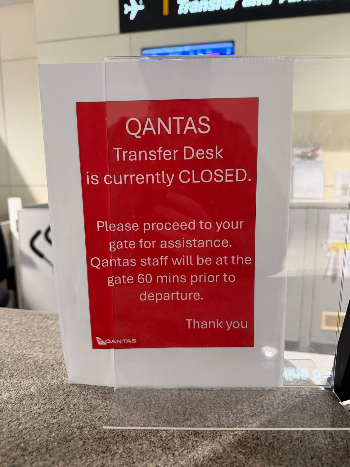 UPDATE: on arrival into BNE, I went to the Transfer Desk, as advised by the comms. Took me a while to find it because there were no signs and none of the few people walking around knew. Not staffed, only this: