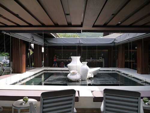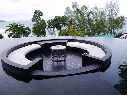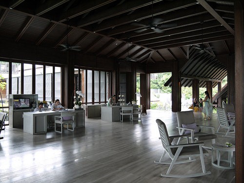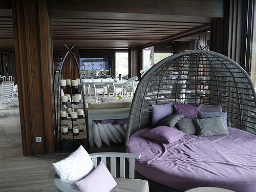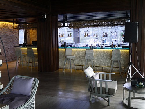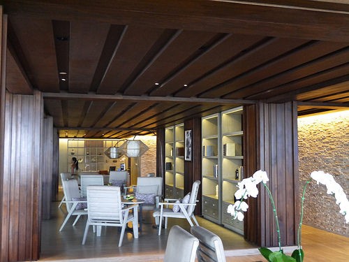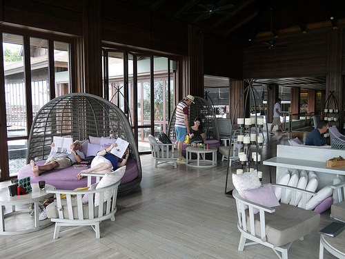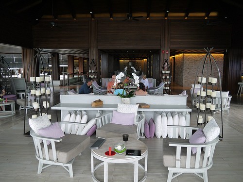 The hotel lobby & bar is very large and pleasant, with very comfy sofas, and semi-beds where it is so nice to read a book in and fall asleep ! Also some sofas surrounded by watervery romantic at sunset !