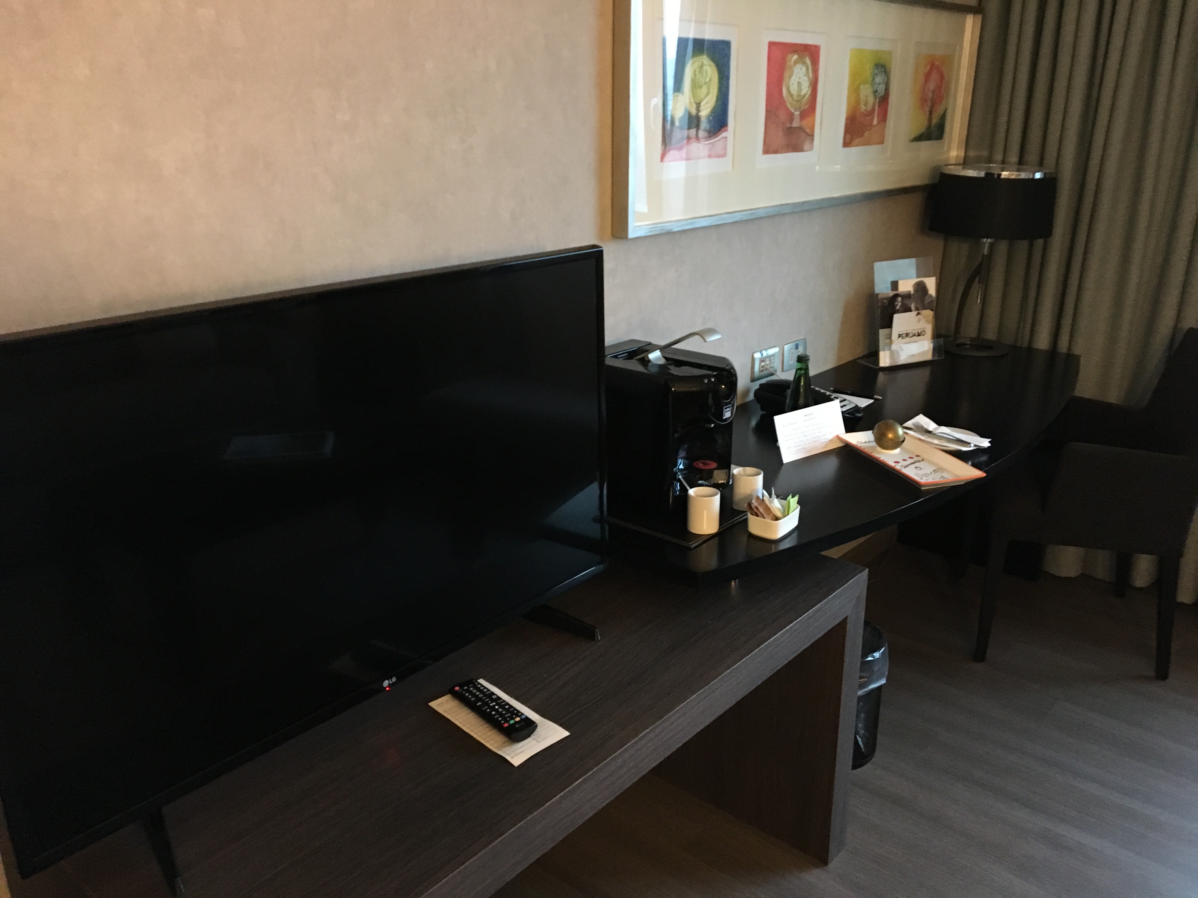 For the Superior room, similar design in a smaller room of course, but of very decent size. This time bathrobe + slippers were available. Espresso machines with 2 capsules which were not replaced the 2nd day (but were replaced on the 3rd day…).