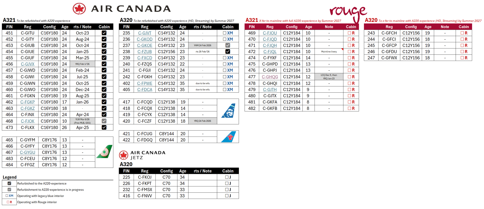 Official News Release here. AC indicates 15 321 and 8 320 to be refurbed, but has since leased additional aircraft, transferred from Rouge, and announced that Rouge will have an all 7M8 fleet. Aircraft are being upgraded to the A220 standard. Modifications include Airspace XL overhead bins, brand new seating, improved IFE with exterior tail and belly cameras, Bluetooth-enabled monitors, Intelsat 2Ku Wi-Fi (upgraded, satellite-based), LED mood lighting, power outlets, USB-A and USB-C at every seat.