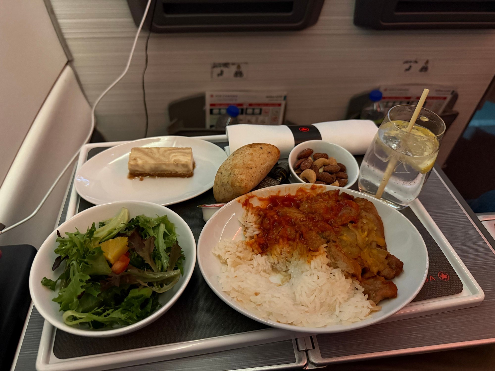 AC550 YVR-LAX tonight, I preordered the sweet & sour pork, what a joke, pork was tender but nothing resembling a sweet & sour pork, maybe 2 or 3 tiny pieces of onion in the sauce that was more of a tomato ketchup with vinegar. Service was almost nonexistent with no drink refills offered until after the prepare for landing announcement. 3.5 cashews in an otherwise bowl full of almonds. Piss poor business class service overall. Way better experiences in united, Alaska and American last year.