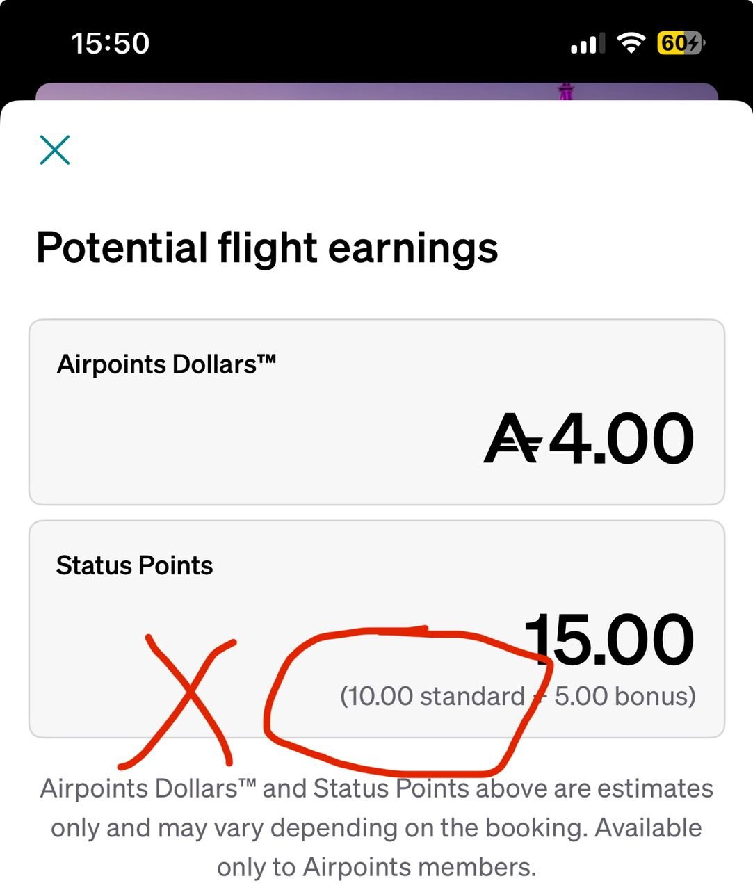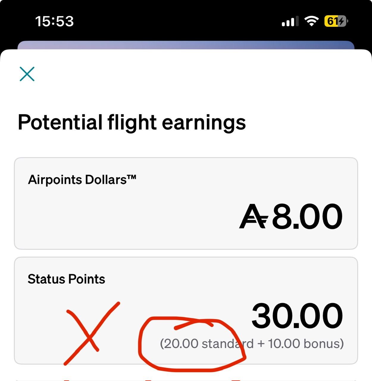 As a further point for consideration - we took NZ23 (YVR-AKL) in Business in May last year (2025) and earned 492.90 Airpoints and 456 status points. If I recall correctly, the flight was ticketed in Z class.