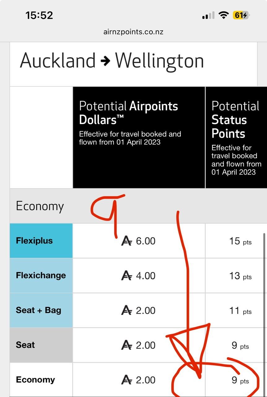 The app says the domestic sectors earn 10 and 20, however I will actually earn 9 WLG-AKL (S), and 30 AKL-WLG (Y) based on the calculator and having done this many times.