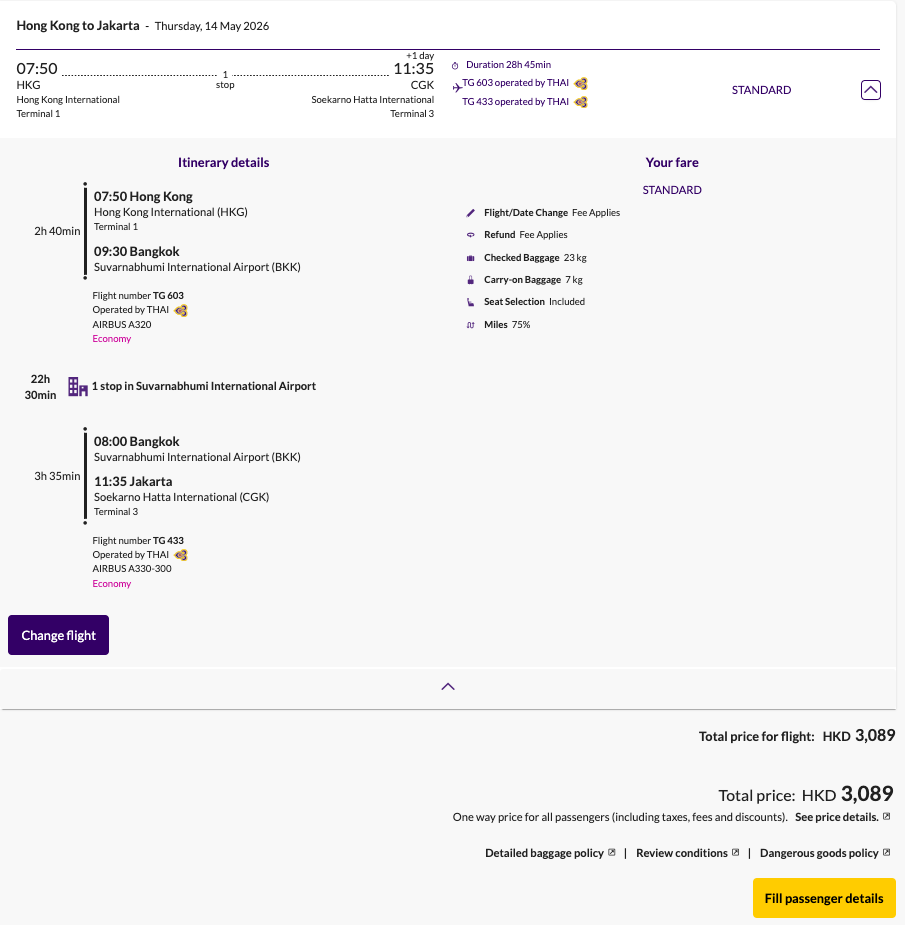 This is a one-way fare with a long connection in BKK. Note I can't quickly determine the exact fare class for this fare - THAI makes it tricky