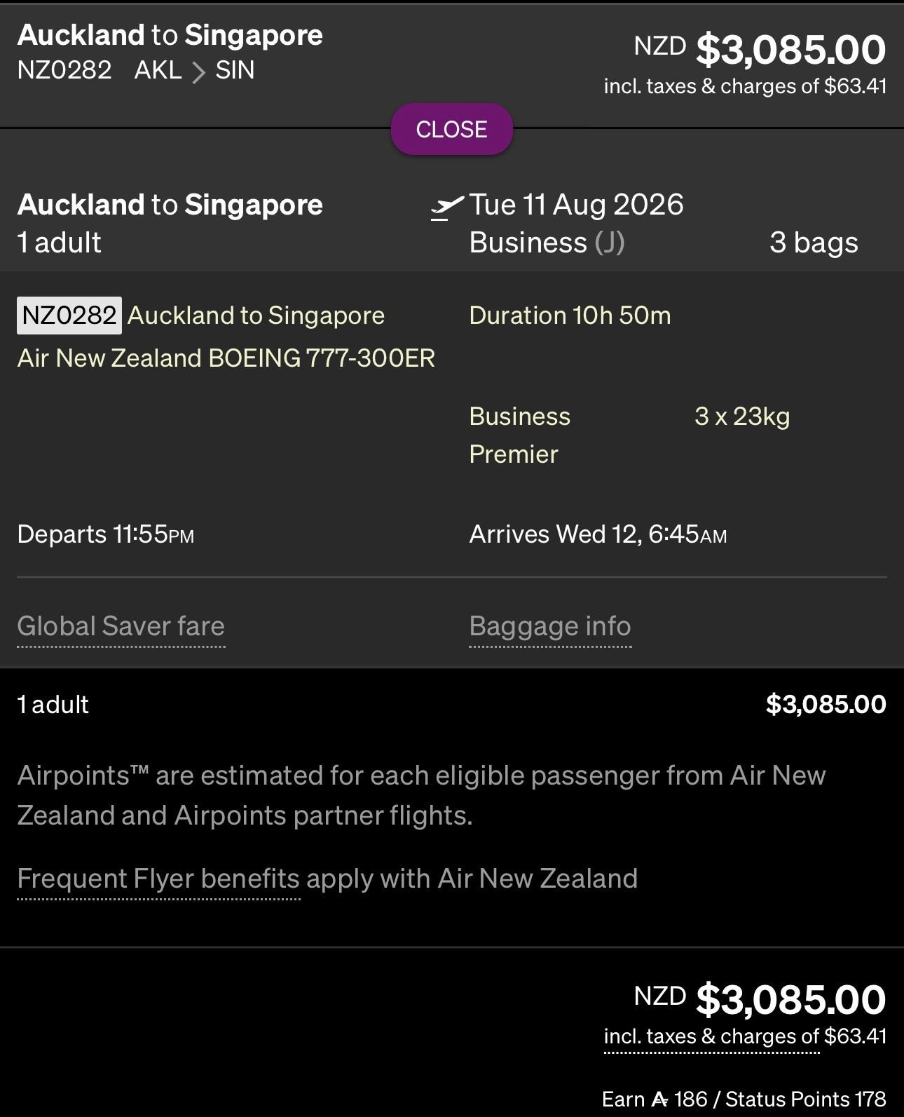 If I wanted to go AKL-SIN in J, at their current sale price this would cost $3,085 (one-way) and earn 178 SP, so $17.33/SP.