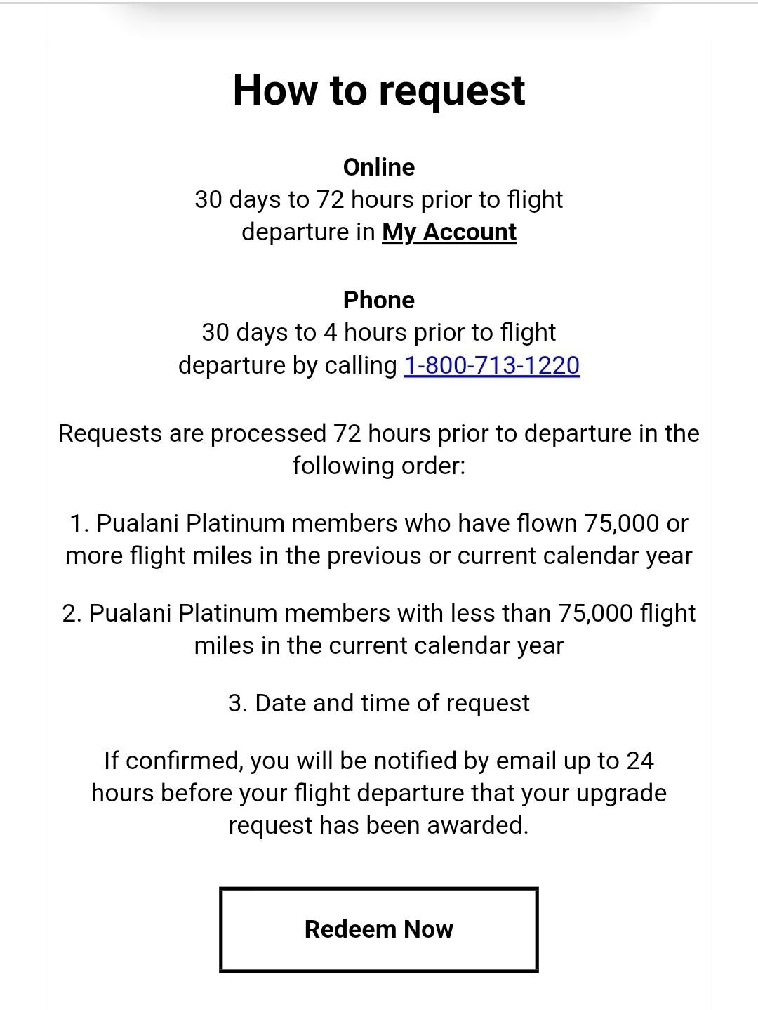If confirmed, you will be notified by email up to 24 hours before yourflight departure that your upgrade request has been awarded.