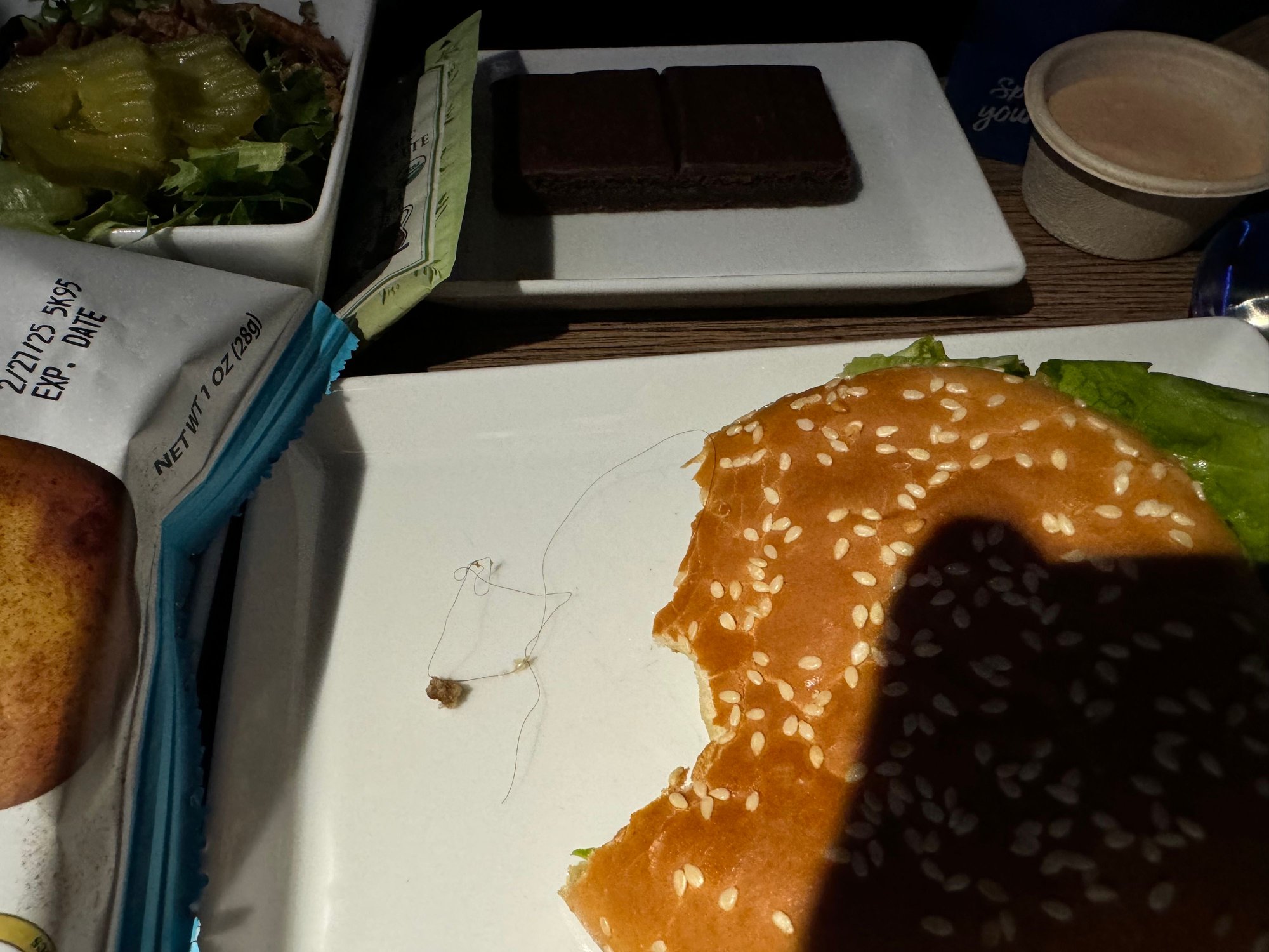 My wife and I both had the burger. Mine came with a hair in the middle. Crew most apologetic and offered me something else but Id lost my appetite. They took photos and said theyd report it. Ill be doing the same when I get home. In the meanwhile