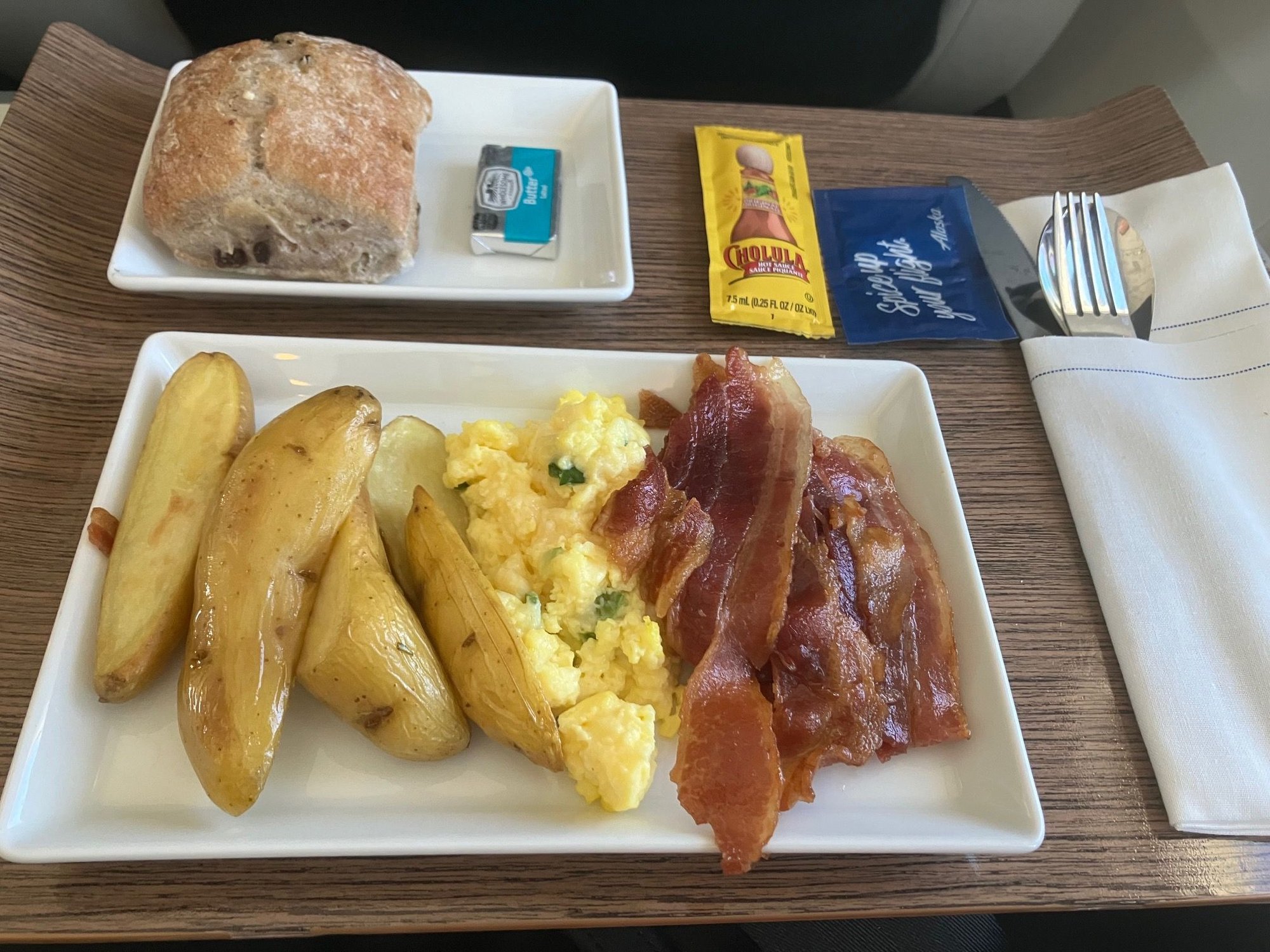 Got upgraded at just under T-24 so no opportunity to pre-order, but I would have picked this. Parmesan eggs and bacon. Very tasty but the proportion of eggs to the other items was too small. That was a massive amount of bacon. Accompanied by a warm raisin roll. I would have killed for a plate of fruit with this. Service was good.