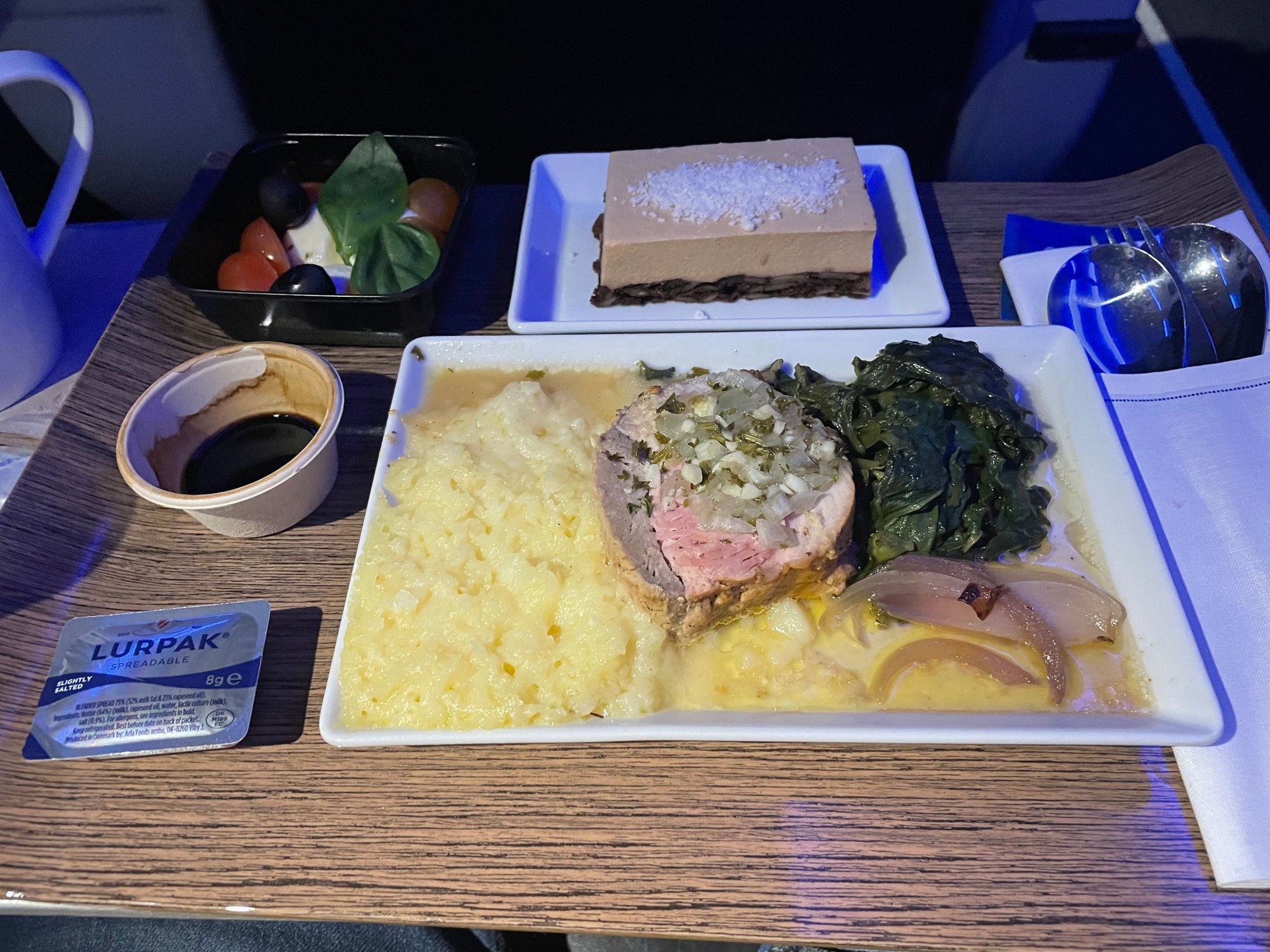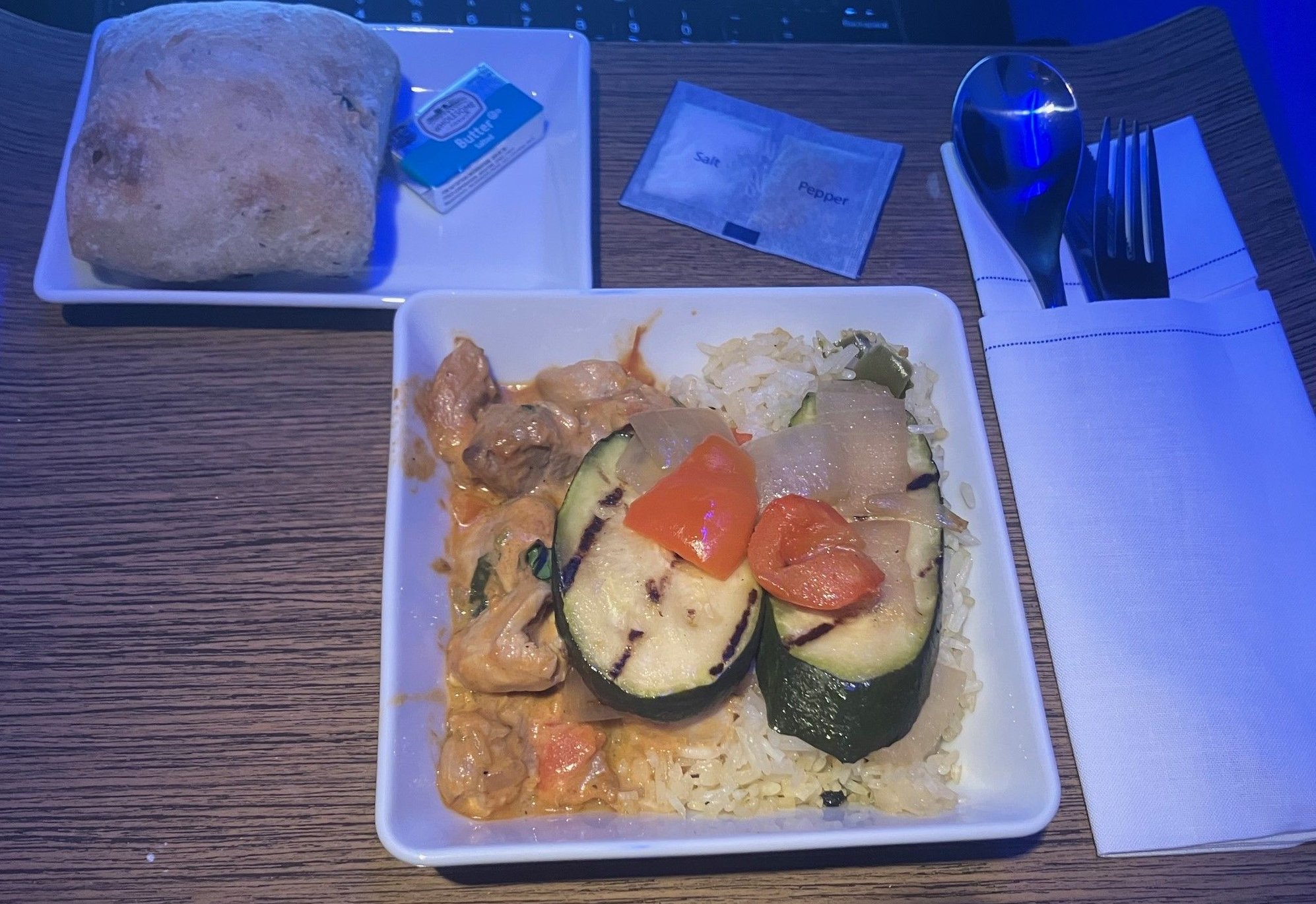 Preordered the Brazilian Chicken and thought it was great. Accompanied by an olive roll. I'm not a fan of olives so would have preferred something plainer, or at least a choice. Dinner was preceded by drinks and the miniscule tray of nuts and salty things. Service was a bit off. I was in row 3 and hadn't yet gotten my dinner when the FA was removing trays from row 1. Dinner was followed almost immediately by the snack basket, and then a bit later by a cold chocolate chip cookie for dessert. No PDB.