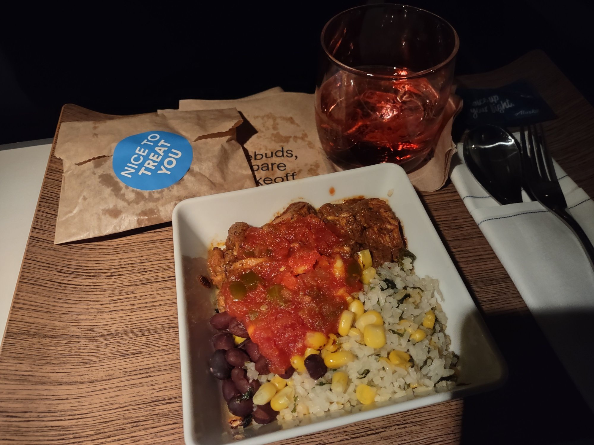 Got upgraded around T-2 so no time to pre-order the Tillamook Cheeseburger but can't complain too much since an upgrade on an -800 is pretty rare these days. Of course the only thing they had left by the time they got to me in 3C was the chicken bowl which sounded ok so I figured I would at least try it--never again. I tried to eat the chicken but it was drenched in a brown sauce with such an overpowering flavor (not necessarily spicey which I usually like--just not good) that I couldn't eat another bite. Since there was no salad or roll to supplement the meal (probably not long enough of a flight) I went ahead and ate some of the rice which actually was light, fluffy, and delicious. It probably didn't help that my seat mate had preordered the Tillamook Cheeseburger and chips which looked great as always. Positive side note: I tried another new-to-me meal option on PDX-SFO that I flew on 12/30 and it was AMAZING--the Mediterranean Chicken Salad--would definitely order that again in a heart beat.