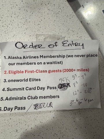 This is good to know, I have two more AS flights this year, while I've been lucky enough to not have to endure a waitlist, if this piece of paper is in fact the pecking order? I'll be booking away from AS until they get their lounge operation up to OW par. Currently I fall under numbers 3 and 5. As of April 2026, I'll just be number 5. As much as I like to add AS to my mix of West Coast flying, their inability to move fast and make the commitment to grow into a OW carrier is going to cost them my money. (First World problem I know, but I place a high value on lounge access).