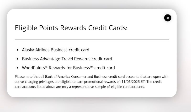 You are my go to for all things Alaska Airlines. You have extraordinary knowledge. But are you sure about this? I just checked the B of A website and it says:Please note that all Bank of America Consumer and Business credit card accounts that are open with active charging privileges are eligible to earn promotional rewards on 11/06/2025 ET. The credit card accounts listed above are only a representative sample of eligible card accounts.