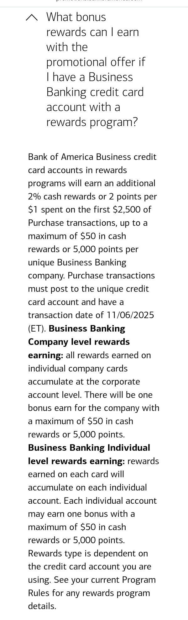 You're giving me heart palpatations! I've done the spend on 3 cards. Here's what the Ts and Cs say:Credit card accounts in rewards programs will earn an additional 2% cash back, 2 points, or 2 Miles per $1 spent on the first $2,500 of Purchase transactions, up to a maximum of $50 in cash rewards, 5,000 points, or 5,000 Miles per unique Consumer credit card account or unique Business Banking company. Purchase transactions must post to the unique credit card account and have a transaction date of 11/06/2025 ET.