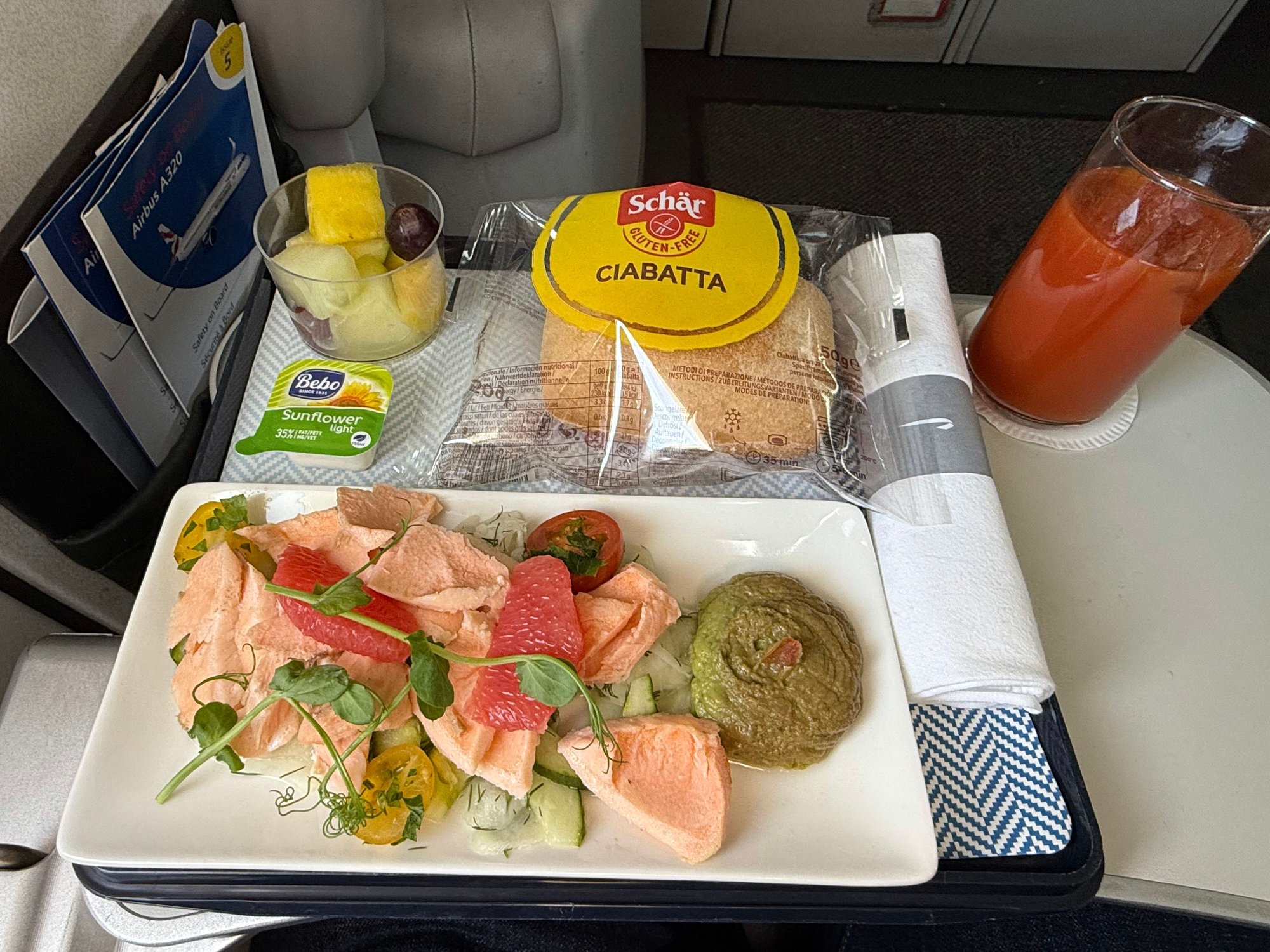 Lunchtime flight to Jersey, barely time for lunch and a coffee before our descent (landing nearly 25 mins ahead of schedule on a 1hr 5 min flight!), but heres my GFML (Gluten Free) meal. Salmon with cucumber and fennel salad with some spicy avocado on the side. The avocado tasted better than it looked!