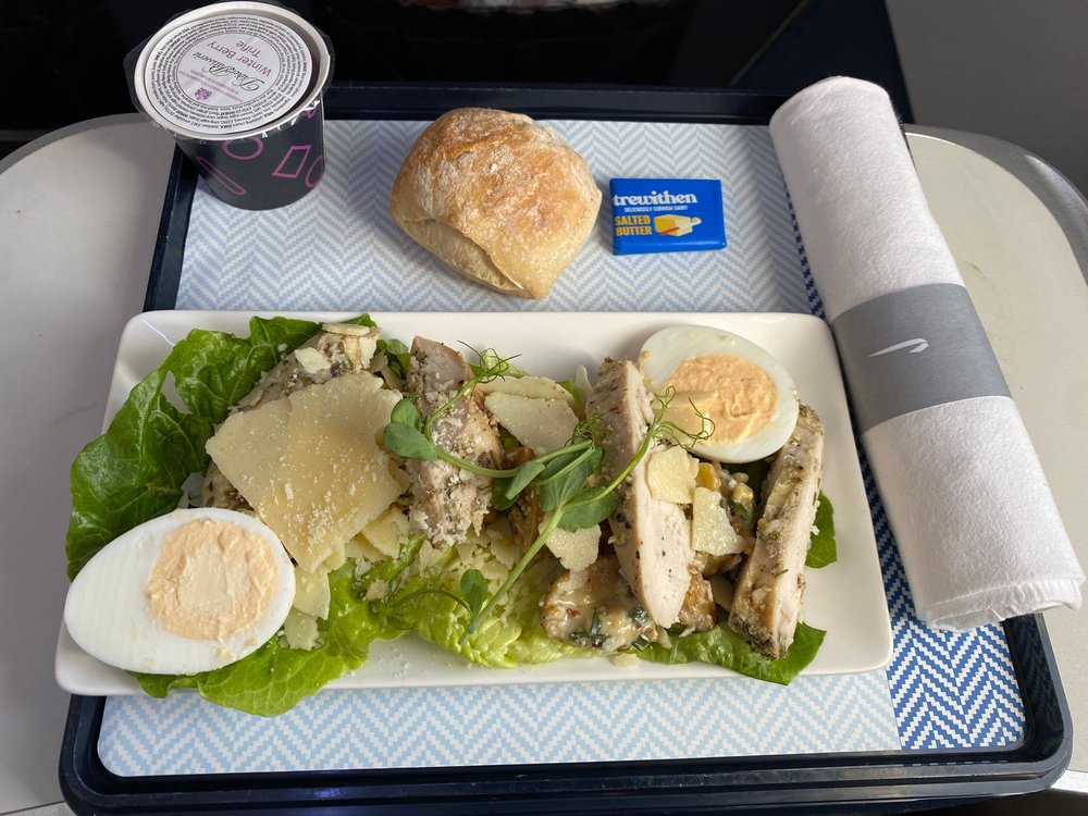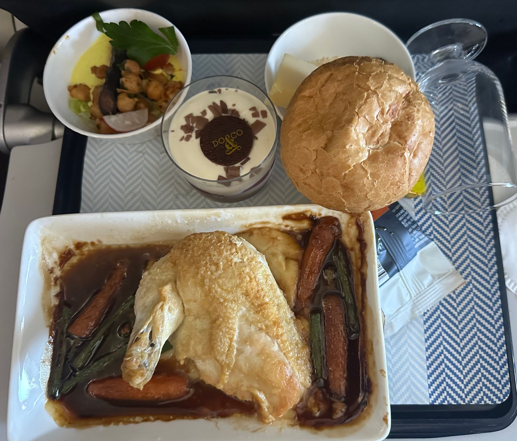 Tastes better than it looks. Chicken a bit dry. Big CE cabin. Good service front to back. Plenty of drinks. This isnt a business class product. Even my low expectations were not met. But food was ok.
