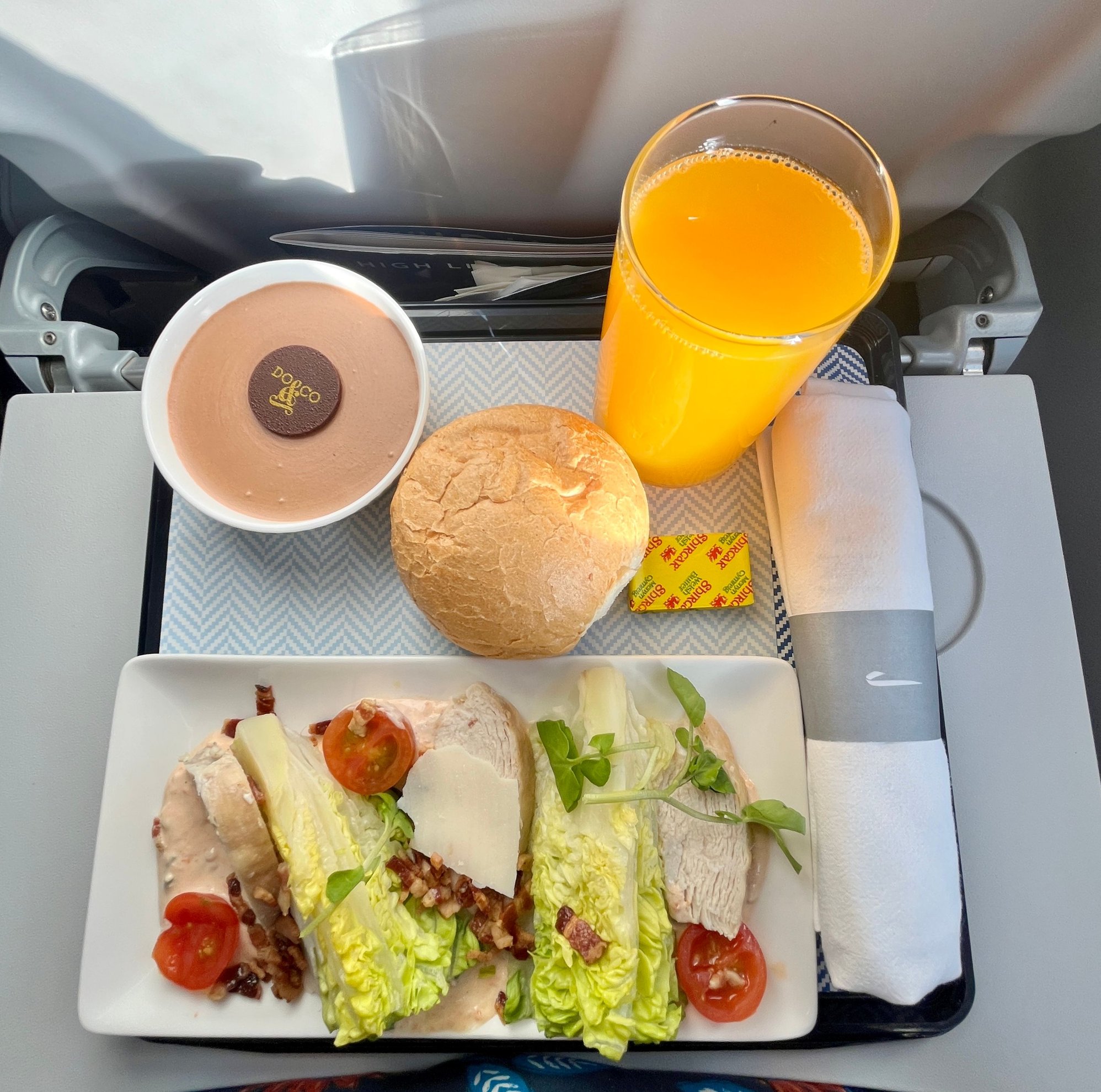 Just had that very meal on BA806 LHR-BLL. The salad was delicious, chocolate mousse is a favourite of mine, but the roll was so crunchy on top I’ll be picking crumbs out of my dress for the rest of the day. The bottom was soft, so something in between would have been nice. Still, a really tasty meal in my opinion.