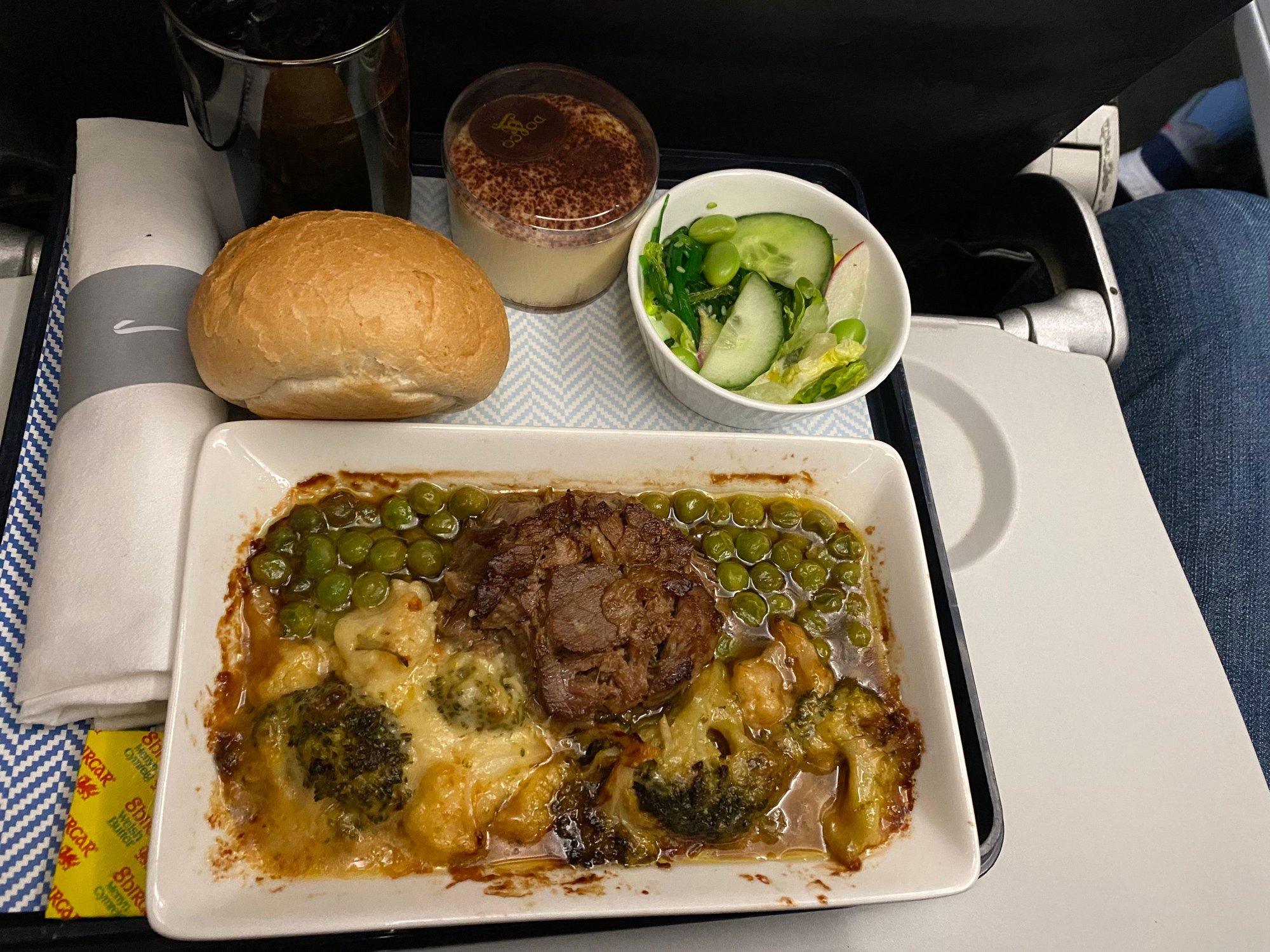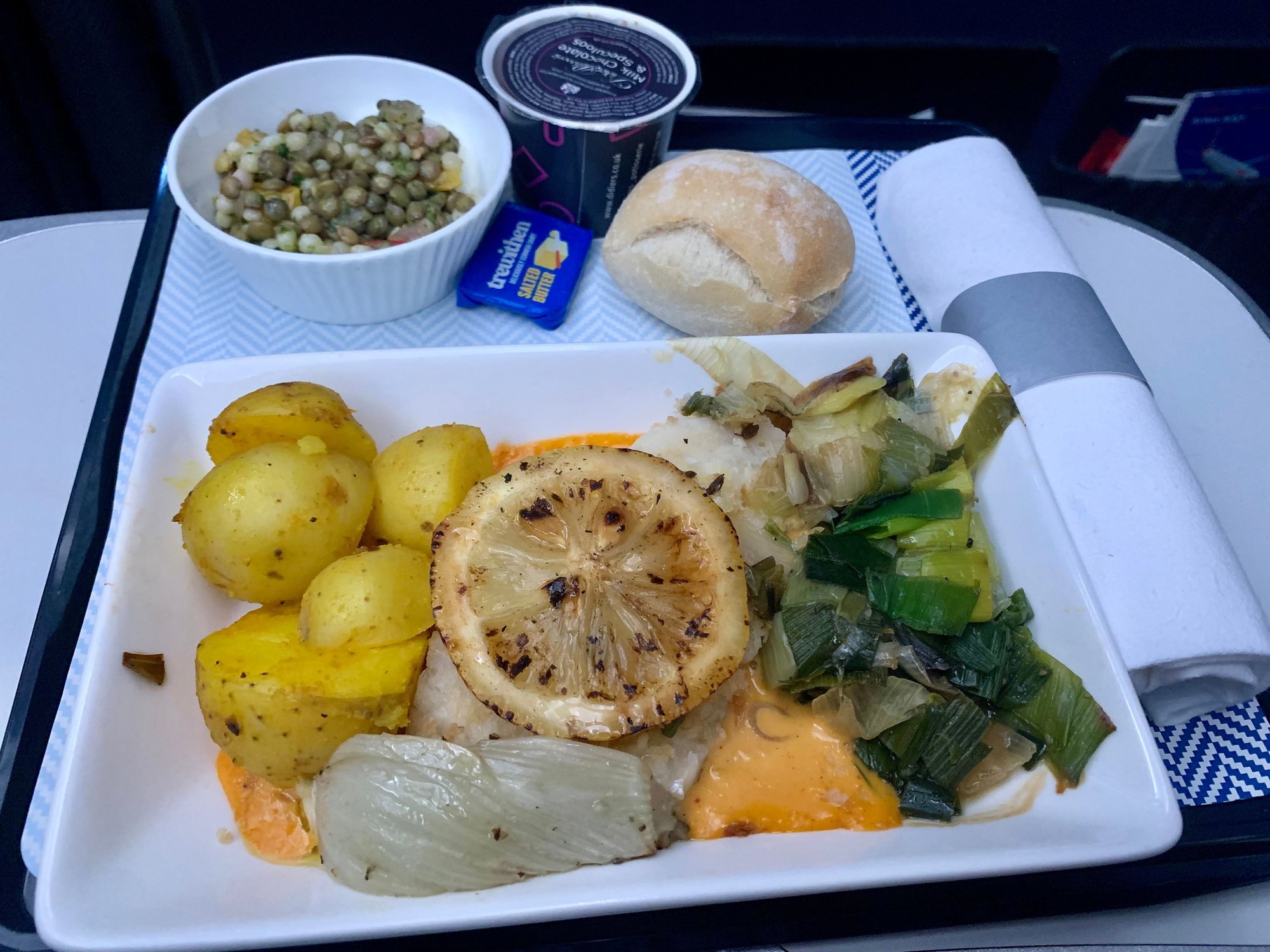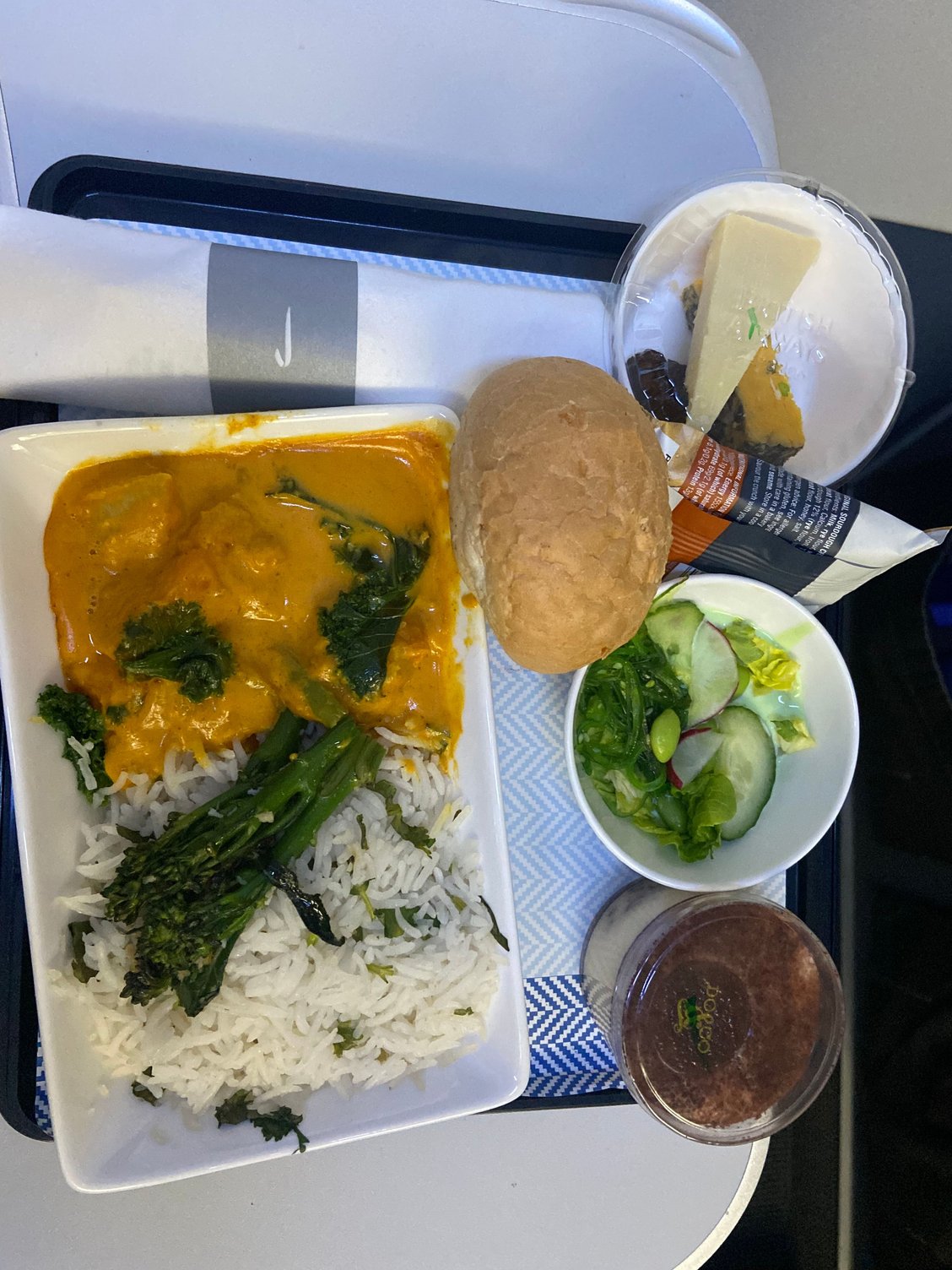 Chicken Tikka which was very spicy we were were warned or Cod with Fennel and potatoes. The potatoes were not totally cooked we thought. There was also a chicken salad. The fish still had a peppery taste but was not bad. It was accompanied by fennel which I adore and which perfumes the fish. The crew were back at the galley after 1 hour 7 minutes and did not stop offering drinks the whole flight. All in all, it was far from bad. The Champagne was Nicolas Feuillatte. My husband was on sparkling water as he had to drive on arrival, bless him. The lentil starter was delicious The dessert was not.