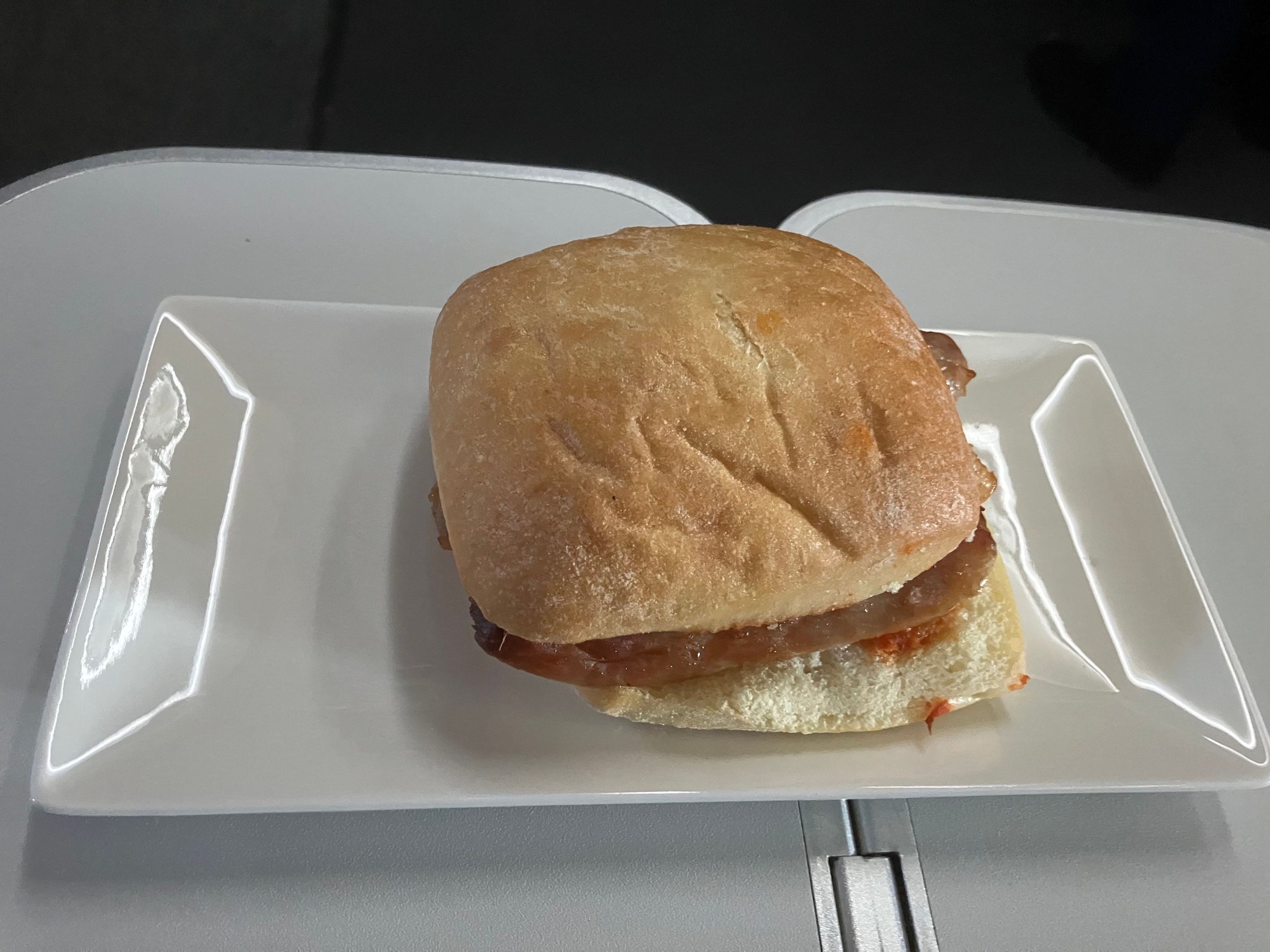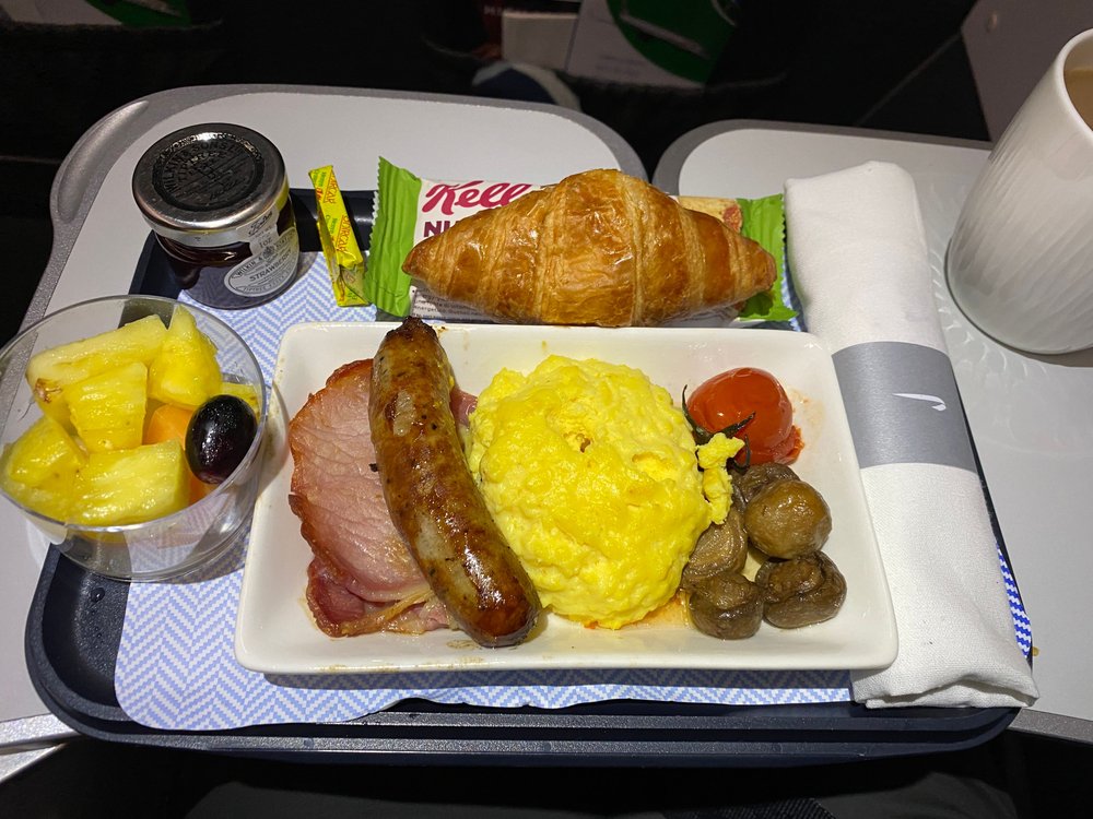 Only 4 rows of CE, with 2 very good CC looking after the cabin. Before push-back the SCCM came round taking breakfast orders. “Sausage Roll?” … no option existed. Beverage order taken at the same time, and delivered soon after the CC unstrapped. The Sausage Roll followed shortly, and as the photo shows came unadorned by Cutlery, Napkin or indeed anything else to consume. Later conversation with the SCCM elicited the explanation that they run this sector with only 3 CC. Why that should prevent the aforementioned Sausage Roll being placed on a pre-loaded tray with Fruit Salad, Granary Bar and Cutlery eludes me.