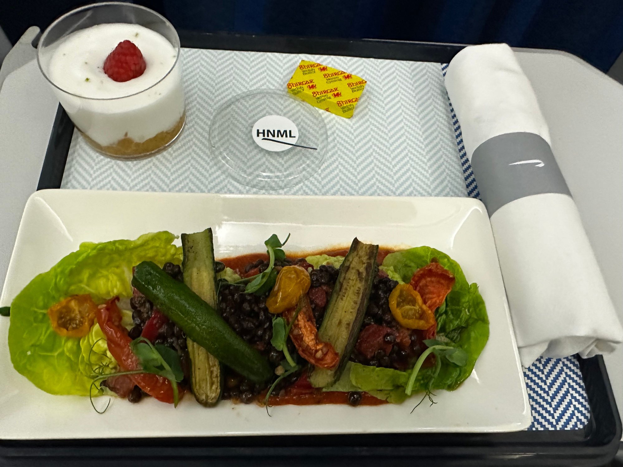 Numbers relate to the post number. Vegetarian means the alternative option provided as standard rather than the special meals. The pre-ordered special meals are AVML (Asia-vegetarian), CHML (children's meal), DBML (diabetic meal), GFML (gluten-free), HNML (Hindu non-vegetarian meal), KSML (Kosher meal), LCML (low-calorie meal), LFML (low-fat meal), NLML (low-lactose meal), LSML (low salt meal), MOML (Muslim meal), VGML (vegan meal), and VLML (lacto-ovo vegetarian).