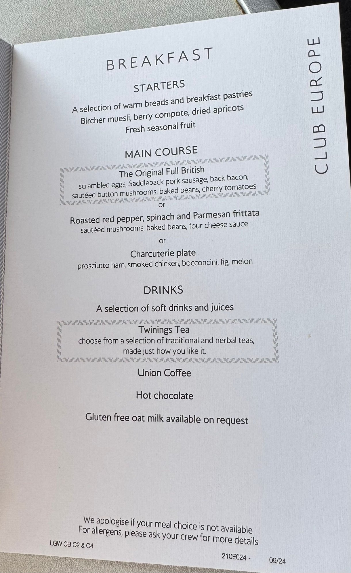 Breakfast menu, LGW-ACE 20/11/24