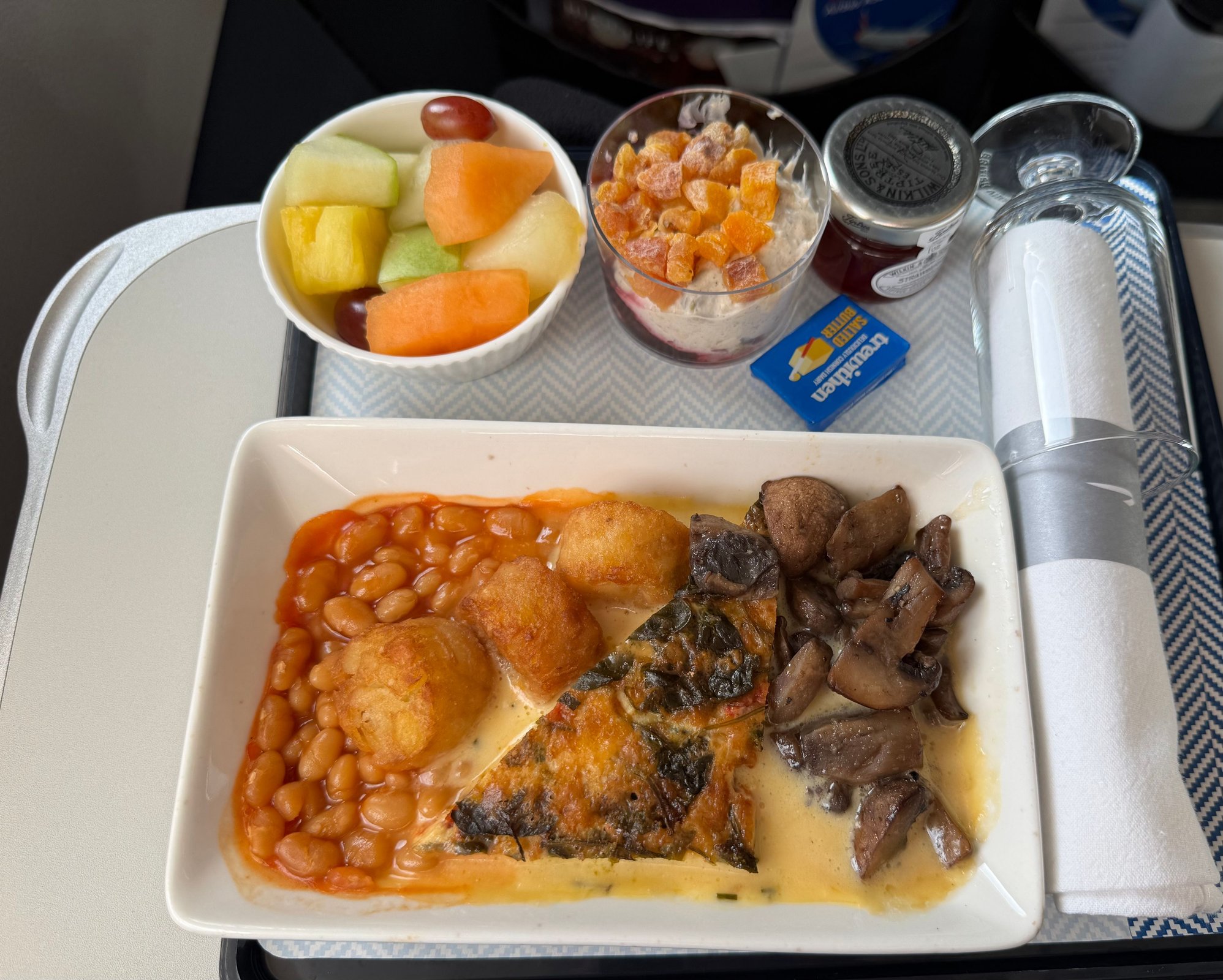 I got talking to another passenger on the way, who had pre-ordered a low calorie meal, and had a wonderful conversation. She recommended the low calorie breakfast - from memory it had some steamed Spinach, eggs, tomatoes and other vegetables and a melon bowl, and did look rather lovely!