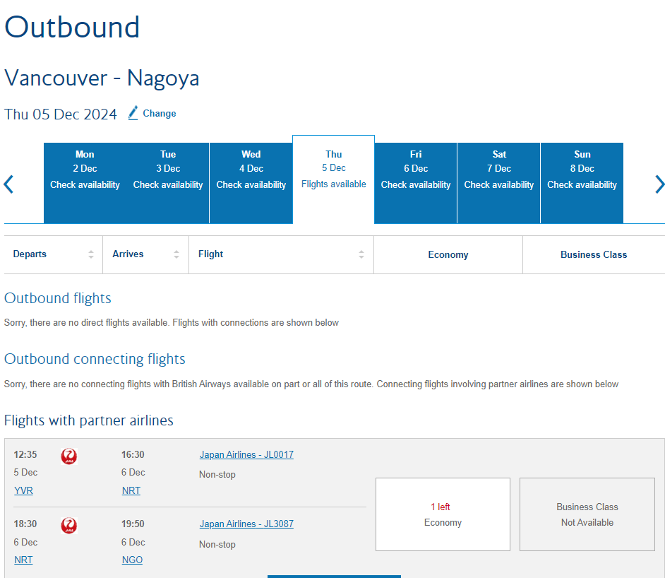 Looking to book December flights to Asia from Vancouver using Avios. I'm trying to get to Phnom Penh but thought it easier to book one leg at a time, Van to Hong Kong or Van to Narita. The BA site keeps routing me via London. Is there a trick to booking a non-stop partner flights from Van on the site? The BA site offers "find availability with British Airways on other dates" but, again, only offers flights via London. Once there, it links me to Cathay. Any suggestions? Thanks in advance.