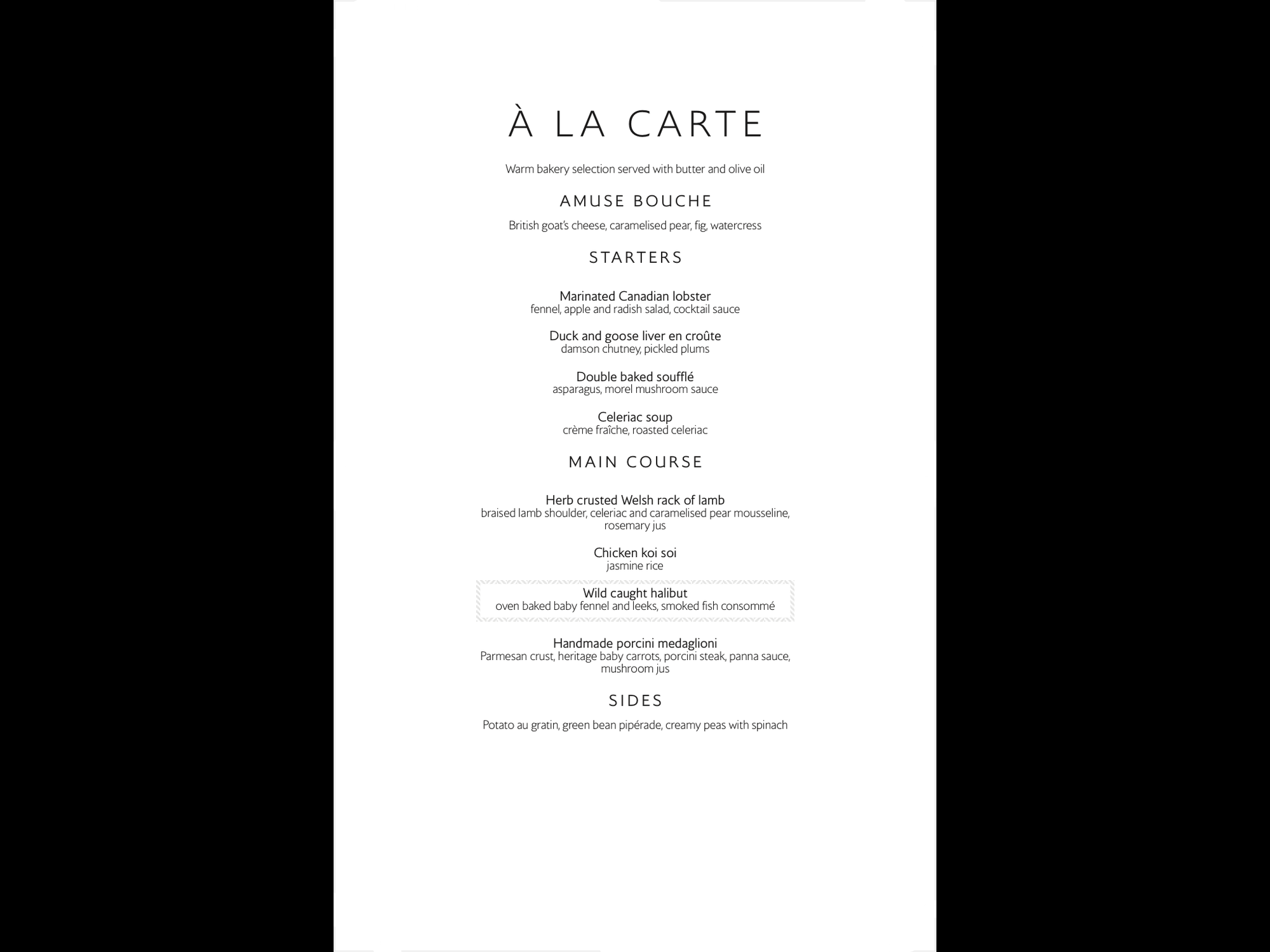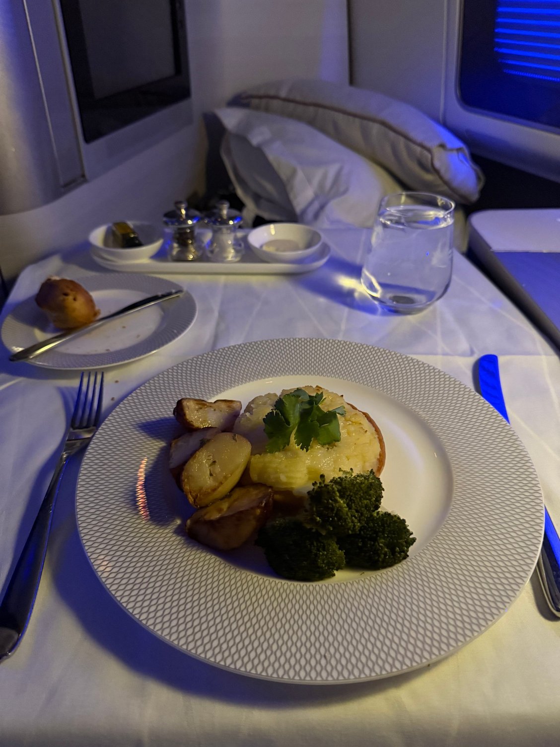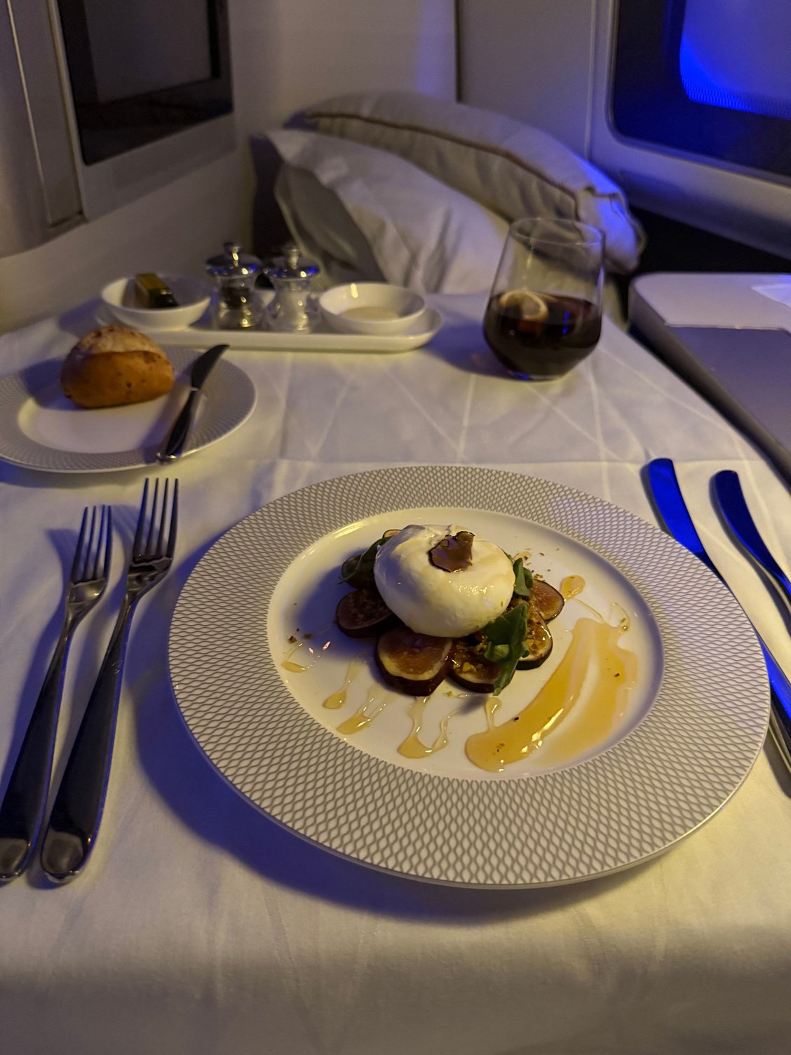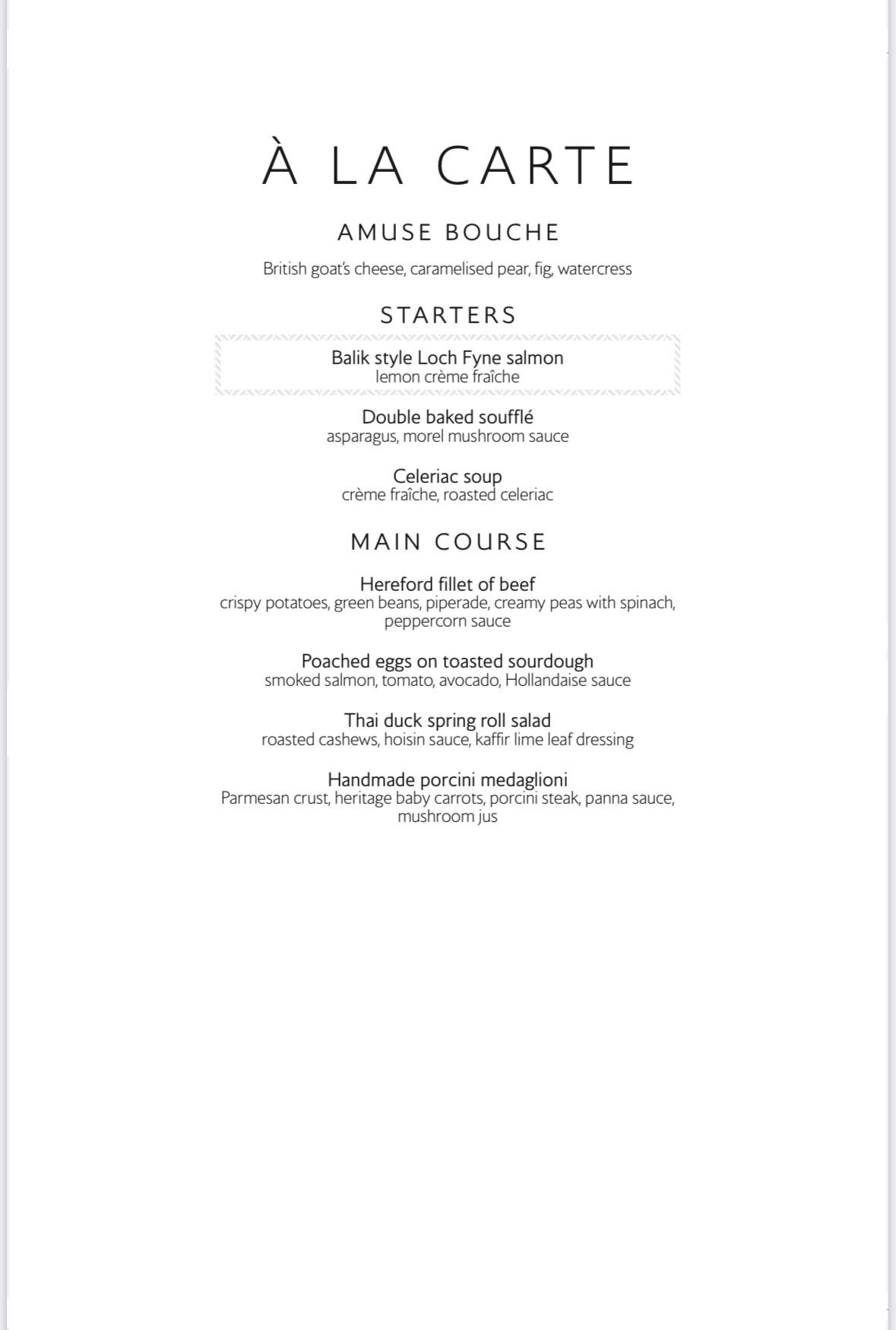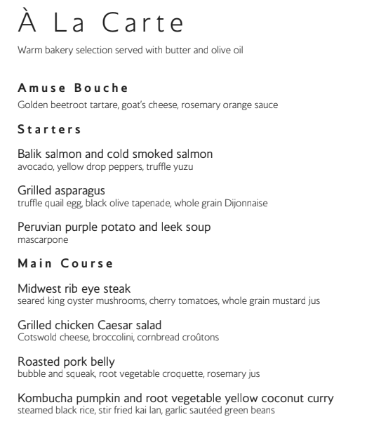 The two South African wines on the wine list are indeed good but it is hardly a sign of BA upping it’s game in the wine department more a sign of they stumbled across some wines which met their wine bottle price which seems to have been consistently “enhanced” over the years. The menu we had whilst not brunch still seemed like the remnants of brunch. The only main course not brunch like was filet mignon which I tend to avoid on BA. |