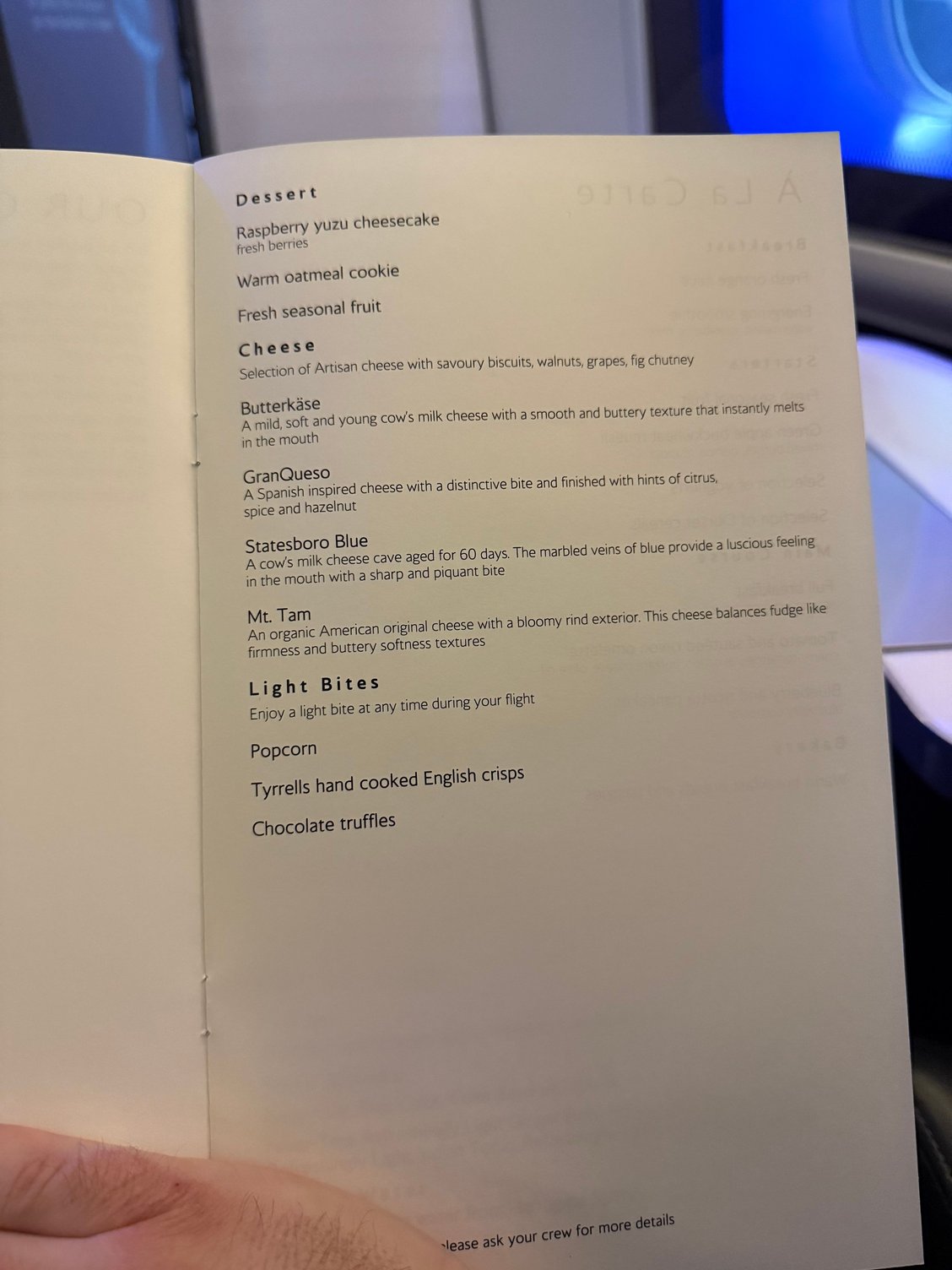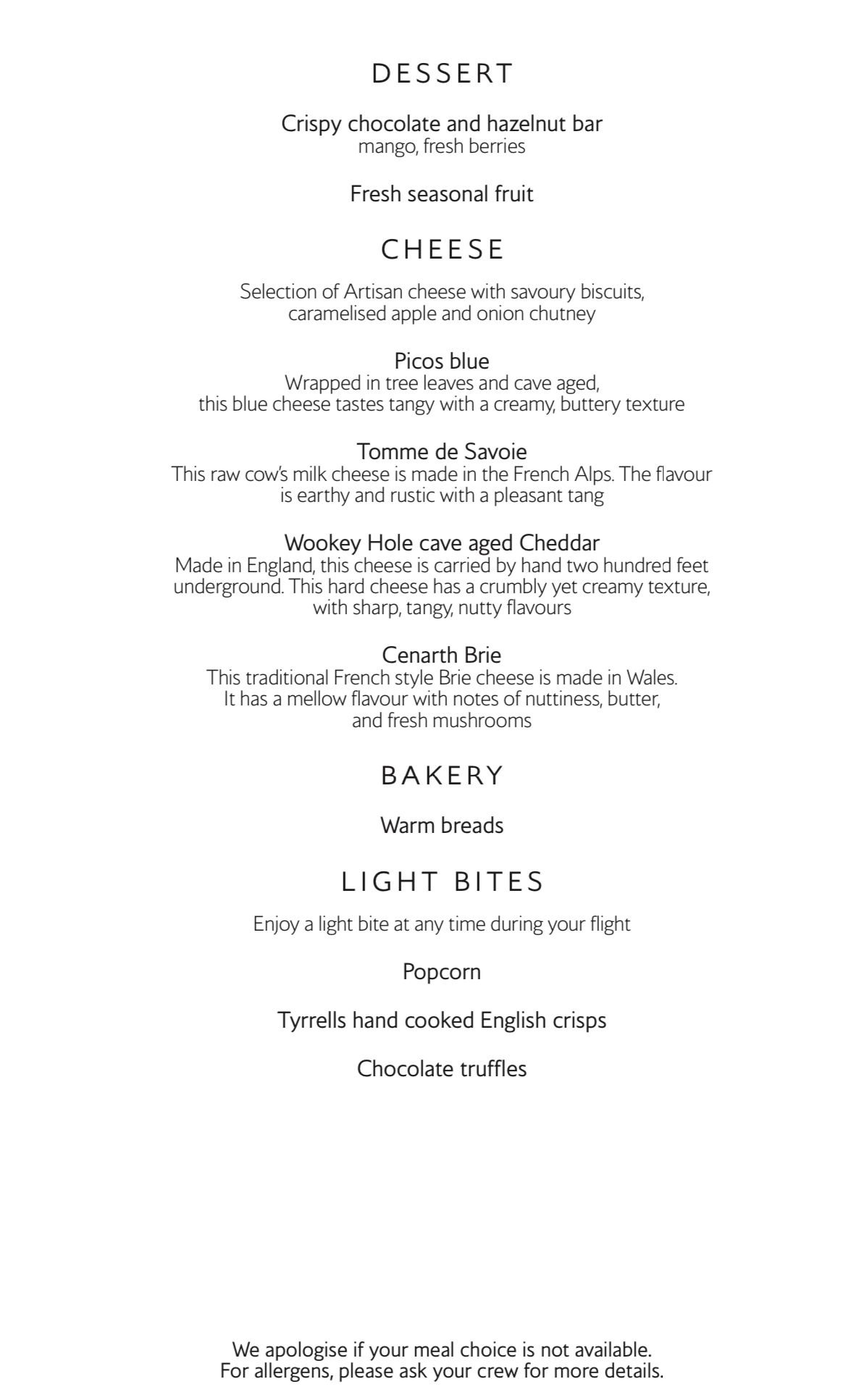 looks like this is still the brunch menu?! can I complain to the IFM once on board as the choices really don’t seem First. note- under light bites they seem to have removed the sandwich option… Interesting to see another egg option on the light meal menu too! I had a colleague on the same flight to DFW last week but in club and no brunch/egg options provided there which makes this even more frustrating for First. You can see those menus in the FT club food thread. Let us know the outcome of your complaint. |