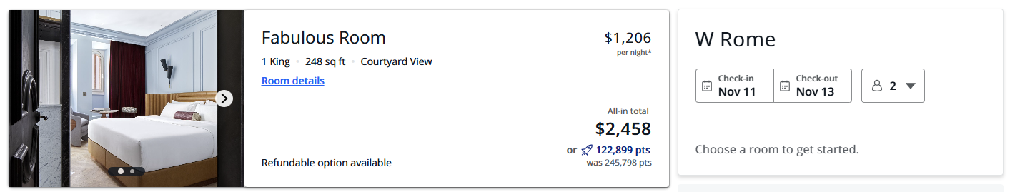 Can you provide your example dates at W Rome? I just checked a random date of Feb 11, member flexible rate is 549 EUR all in, EDIT is 655 USD. The difference is 17 EUR which is just the rack rate vs member rate.