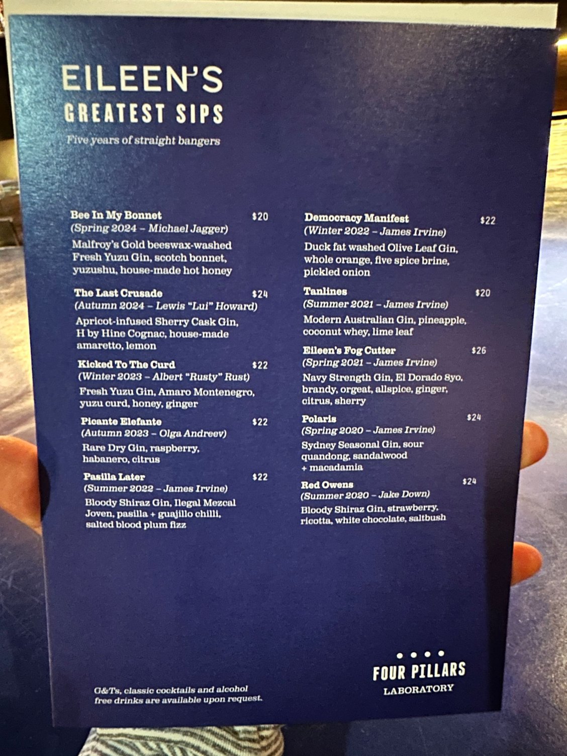 I also go to the Four Pillars Laboratory whenever I'm in Sydney. It recently celebrated its fifth anniversary and I was lucky enough to catch the limited edition celebratory menu on the very last day it was offered: https://cimg7.ibsrv.net/gimg/www.fly...b84ddcc84.jpeg I've never had the particular one in your photo. Hopefully they bring it back someday - the botanicals and notes sound so interesting. In my home bar, I currently have their: Bloody Pinot Gin; Australian Gin; Green Apple & Rhubarb Gin; My New Go-To Gin (notes of quandong, yuzu, lime, lemon myrtle). I tend to pounce as soon as they release some kind of interesting limited edition. |
