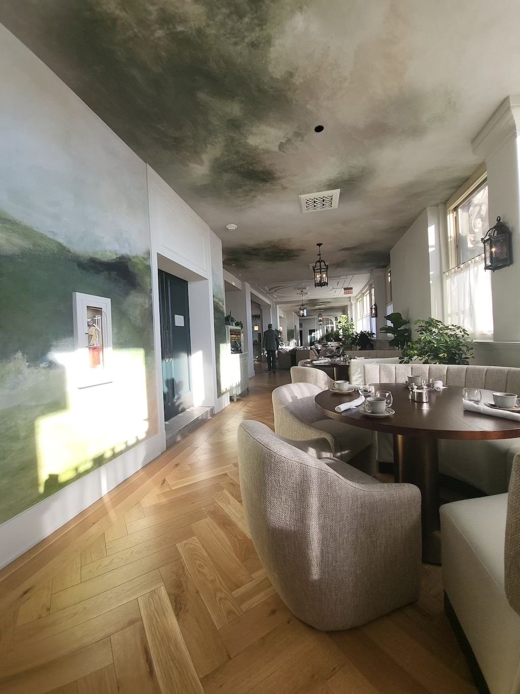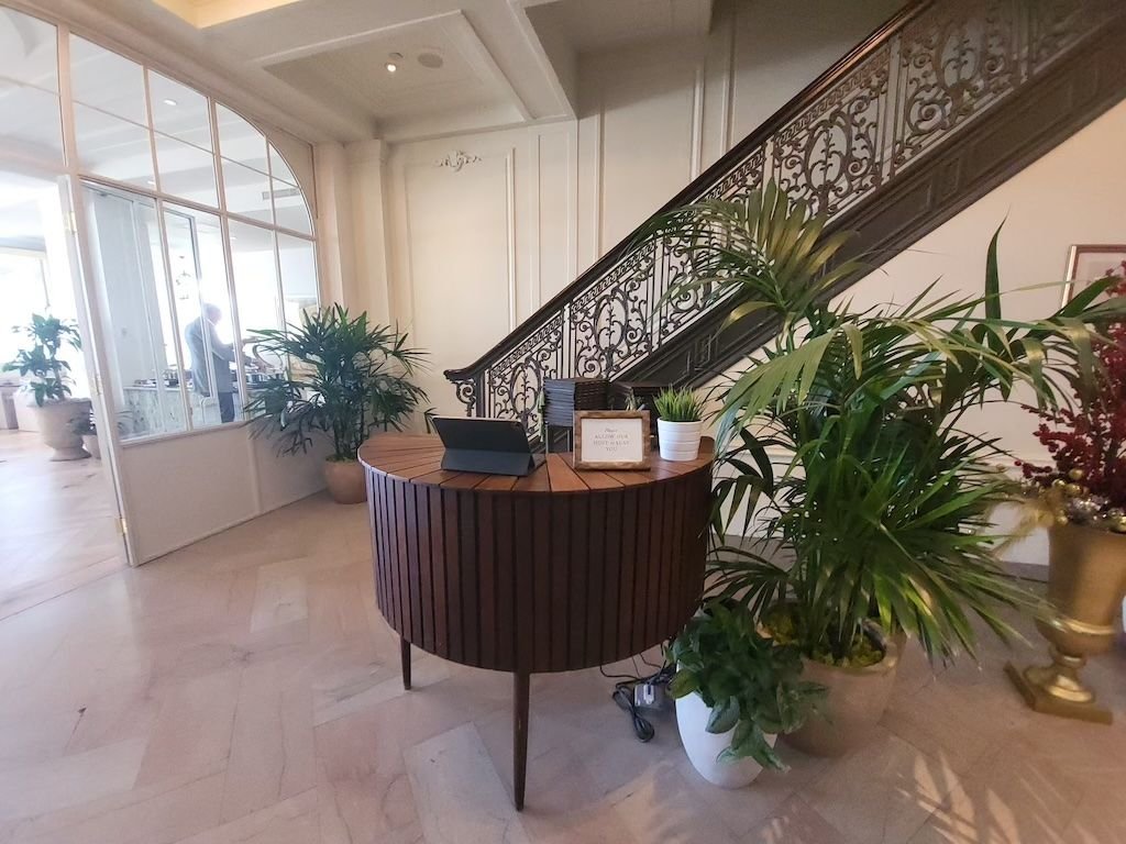 The renovation was definitely needed and felt about 75% of the way there during our stay (perhaps they're not done as scaffolding is still up). Things are much brighter/well lit, its more inviting, fixture are modernized, FoH service levels are good but there appear to be a handful of incomplete tasks, overlooked items and some corners being cut in the renovation. I'm honestly not sure what "style" they're aiming for. Lots of "modern" greys in the room/hallway, the public spaces (lobby & ballrooms) are still guilded age metal, wood and beige tile, the restaurant is green/nature/light themed. The in room decor leaned into art & books, while the public spaces had framed nature paintings and classic automobile posters. Early check-in was honored, and Globalist upgraded to junior suite. Was proactively welcomed back having stayed pre-renovation, but talking to staff most FoH are new to the property (but a lot of BoH are apparently returning). There are two check-in desks, the main desk is in the primary lobby off of Broad St. They kept the old lobby off of Chancellor, the side street used to access the Sporting Club and parking garage and it seemed fully staffed as well. No mention of a destination fee ($32) or the welcome cocktail that's supposed to be included in that fee. (then again the fee wasn't expected on a free night) The elevators are still small (and had expired inspections certificates), so you may want to take advantage of bell services for larger bags. The hallway floors have new carpeting and a coat of paint (the coat of paint seems to have literally been thrown over everything as there are remnants like the room number plaques just covered in grey so they blend in) In the junior suite it appears they built some walls to create a "separate" seating area/nook with a couch. There are bookshelves with a bunch of random books choosen I suspect for their aesthetic more than their content. Two lamps fill out the area. Its a cozy spot, but not well thought out as it is dark and the lamps shaded to throw light down so not conducive to reading while sitting. Plus with where the TV is positioned you can't really watch it from this seating area. In addition to the seating area/nook the new walls create a mini foyer by the entrance with the walk-in closet. There were two robes but no slippers in the closet. The laundry bag is a cheap disposable plastic type but was custom printed with a design replicating the wall decoration from the Pergola restaurant. There was another mini foyer over by the connecting door. Combined these new walls and areas does make the room a bit narrower than pre-renovation but the room is still plenty big. The main bedroom area unfortunately adopted the current hotel trend of hard flooring rather than carpet. There is however carpet around the poster bed, so a few steps of warm reprieve before the shock of a cold floor when getting up in the morning. A nice touch is they boxed in the area under the poster bed so nothing can slide/get lost under it. Next to the bed are heavy tables with built in USB A& C and 120v outlets. On one side there was a Marshall branded bluetooth speaker which took up one of the USB outlets. Beyond the bedside table was a standing lamp. Of note, this layout makes it impossible to turn off the standing lamp while in bed - there are no additional bedside reading lights. Nor are there any bedside room light controls so if you forget a light its a walk (on the cold hard floor) to the entrance switches. Interestingly there's no clock (I get it most folks just use their phone) and the landline phone is also not bedside but instead on the opposite side of the room under the TV - so those with a wake-up call will definitely have to get out of bed. Bed was normal Hyatt, with two feather and two foam pillows. In the middle of the room was a heavy table with two seats. The table looks like it was designed to have recessed power outlets as there was a hole cut in it. But without a cover/outlet it was just an annoying hole that things would sometimes fall through. The table is big enough to have two people with laptops working from it but there's no power in the middle of the room. Opposite the bed is the wall mounted TV and a marble topped dresser. One side of the dresser holds the cold box (not a proper fridge, no freezer) - it appears these are recycled from pre-renovation. Inside there were two large bottles of Path branded water - I assume comp for elite (but no note of any charges for non-elites). A few art books were on top the dresser alongside the phone and remote. The TV supports the now brand-standard Chromecast. Off to the side was another smaller table with a Nespresso machine, ice bucket, wine glasses, regular glasses and another lamp. This table does have plugs on it, but unfortunately isnt' big enough to work from with a laptop. Also although there was sugar and cream, there were no Nespreso capsules available. There are nice manual blackout drapes that do help with some of the exterior noise but interior hallway noise can be a problem still. Parts of the room still showed their age even post-renovation, the windows are still drafty and dirty, some of the crown molding is chipped, anything carried over from like the door hardware/windows seemed to not have been cleaned/touched up. As @bpc3qh mentions the HVAC controls seem to be locked to not go below 68 (its a telkonet system so it might actually be centrally controlled). There was no trash can in the room, the only trash can was a cheap flip-top can in the bathroom The bathroom layout has changed, gone are the tubs. The narrow shower stall is where the sink was, and the sink now takes up the width of where the tub used to be. There is plenty of lightning, but the bathroom also has some quirks. The toilet paper is mounted "opposite" from the toilet, so unless you're really tall you can't reach it from the toilet. The tissue box cover is also quartz/marble and surprisingly heavy. Bath p