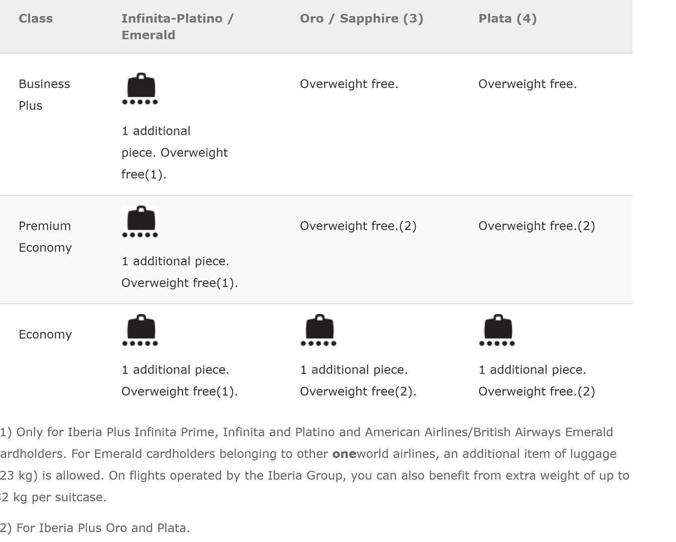 Lastly, does this mean IB does not honor oneworld Sapphire rules for extra baggage allowance similar to AA? I had the same issue with AA last year where I was flying PEY from JFK to LHR. I believe standard allowance is 2x23 kgs for PEY. The duty manager for AA was kind enough to accept my bag weighing 27kgs at that time.