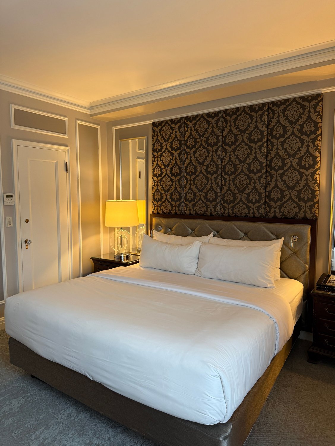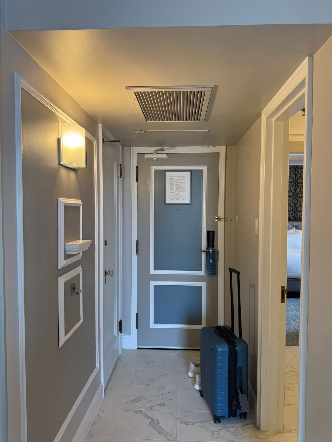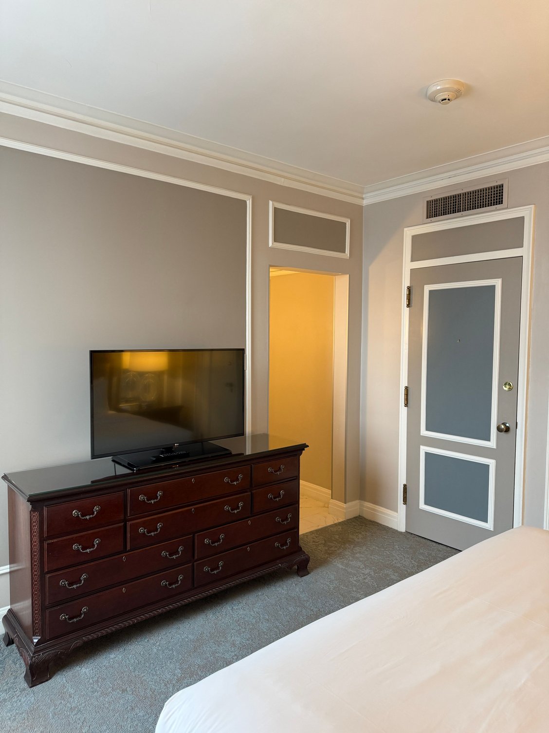 The big surprise is that there is a very large walk-in closet on the other side of the room (away from the bathroom). It's basically the size of the bathroom. Standard equipment inside (robe, hangers, digital safe, iron/iron board, etc.)