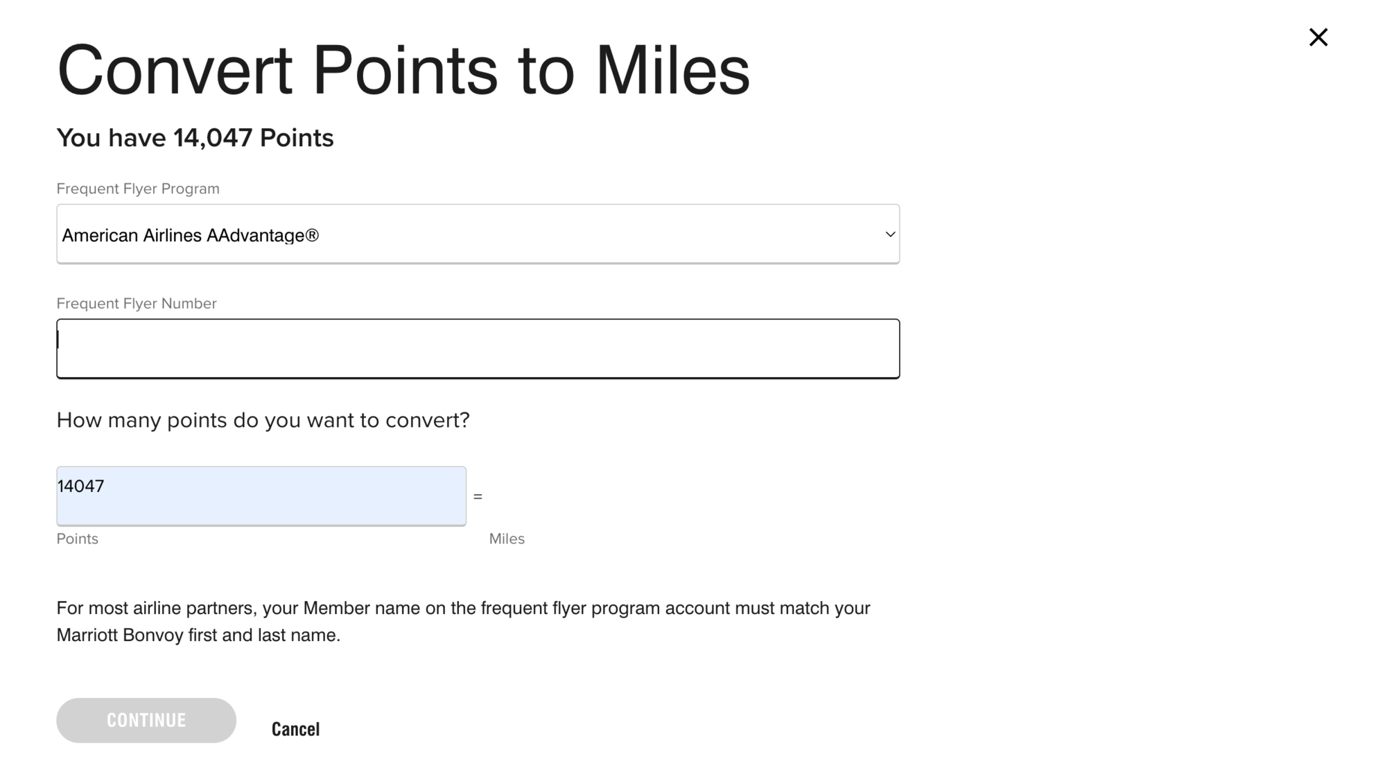 The CONTINUE button is greyed out and not clickable for me when trying to transfer my points to AA, even after entering my AA number (left blank just for the screenshot).