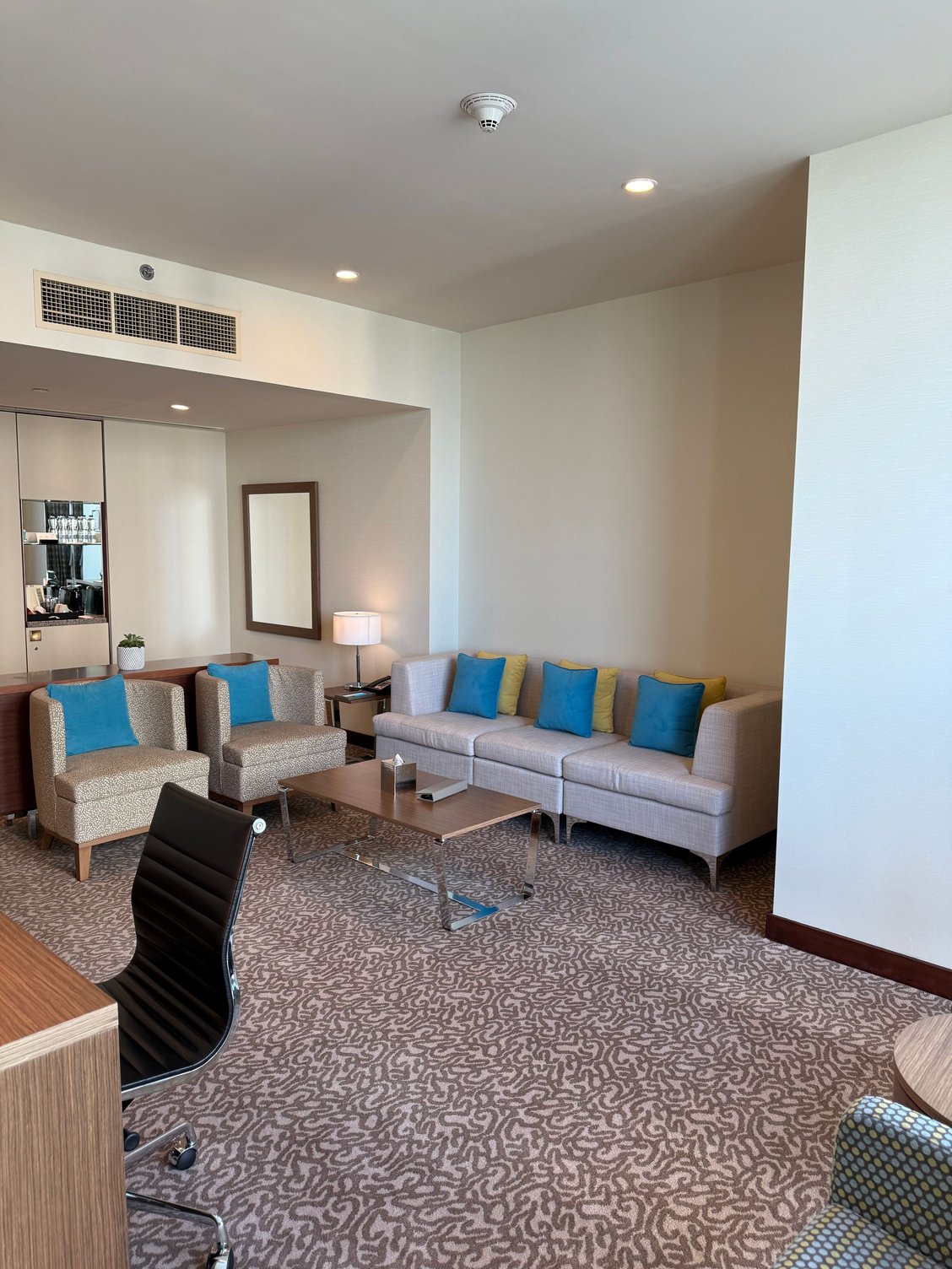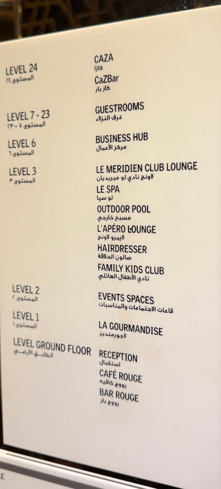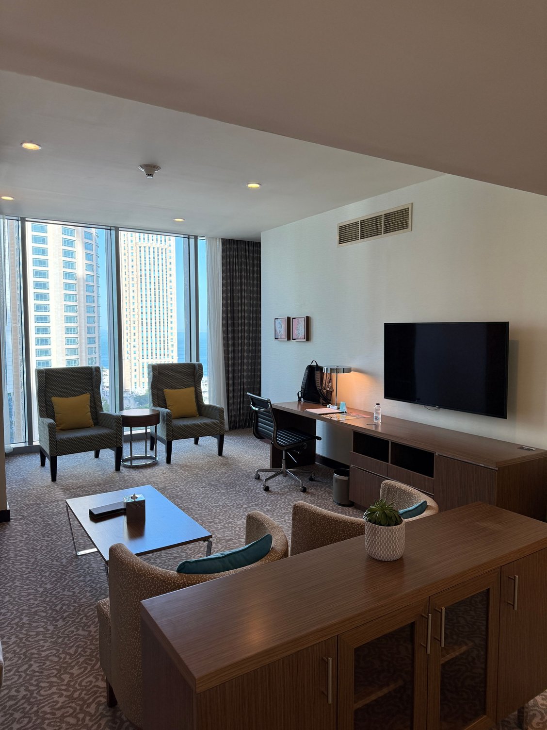 I have just completed a two night stay in the LeMeridien City Center Doha. The first night was paid and the second was a reward night certificate. Was upgraded to a one bedroom sea view suite on 19th floor before arrival with a fruit basket, two bottles of Italian water, and some sweets awaiting in the room. The suite was spacious. The only negative was that the sofa and chairs were not very comfortable to seat on. The lounge provided some hot and cold food with a happy hour from 5 to 7 pm that was sufficient for a light dinner. The staff was very welcoming and made sure that our glasses were full. The breakfast was in restaurant with a buffet and cook-to-order eggs. Our preceding night was in Grand Hyatt Doha and by a comparison the breakfast in LeMeridien had lesser varieties and the Hollandaise sauce for the Eggs Benedict was not quite right. We have asked for a 4 pm late checkout but were allowed to stay only till 1 pm because of the Formula One in Doha and Geneva auto show nearby. Overall, the stay was fine but nothing really special.