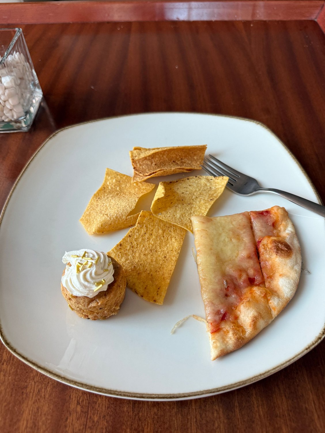 • Club lounge had good brownies and papadum at afternoon and good pizza at evening service