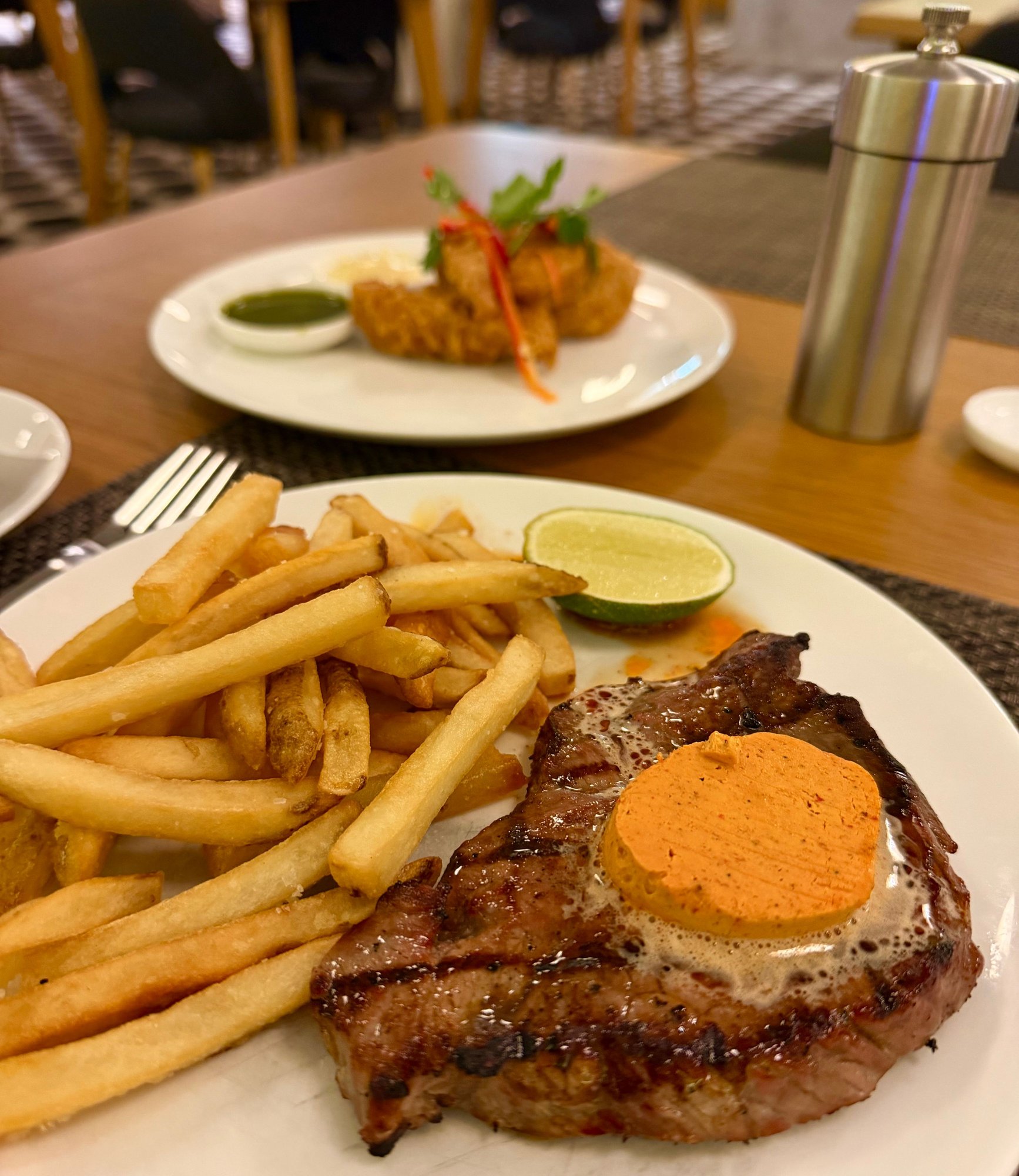 At the lounge and theyre out of Champagne and the steak. The AA lounge not very far away is serving Bollinger at least. Its busy, not the busiest Ive seen this place. Getting a table was very quick