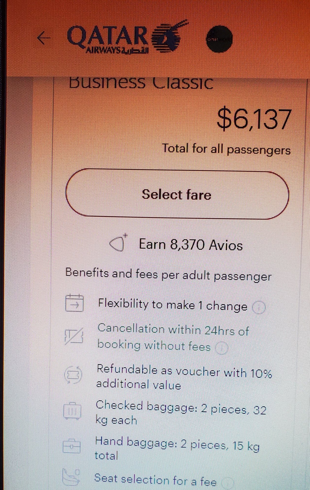 Qatar's OW Biz class CLASSIC Fare NYC to Doha. $12,274 RT yet still have to pay for seat selection