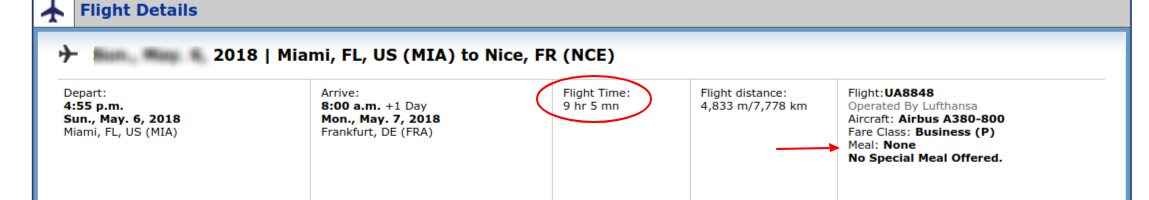 Here is a portion of what is shown on each segment of my itinerary.- showing no meals: