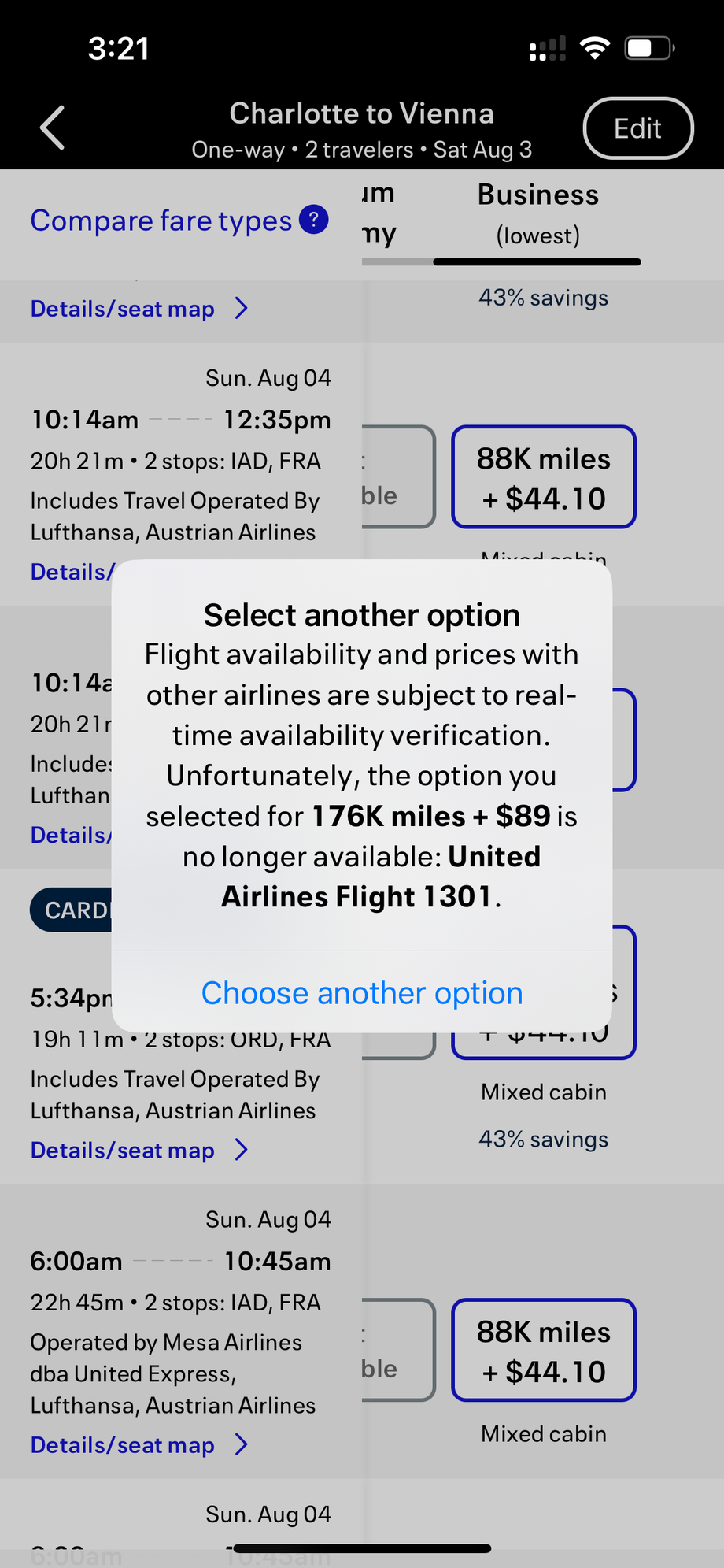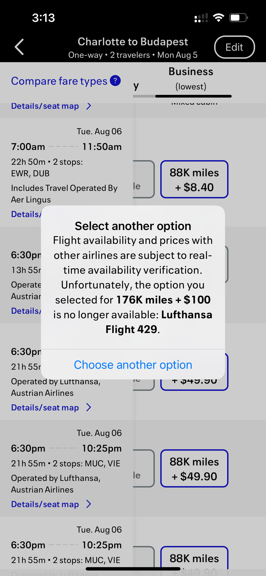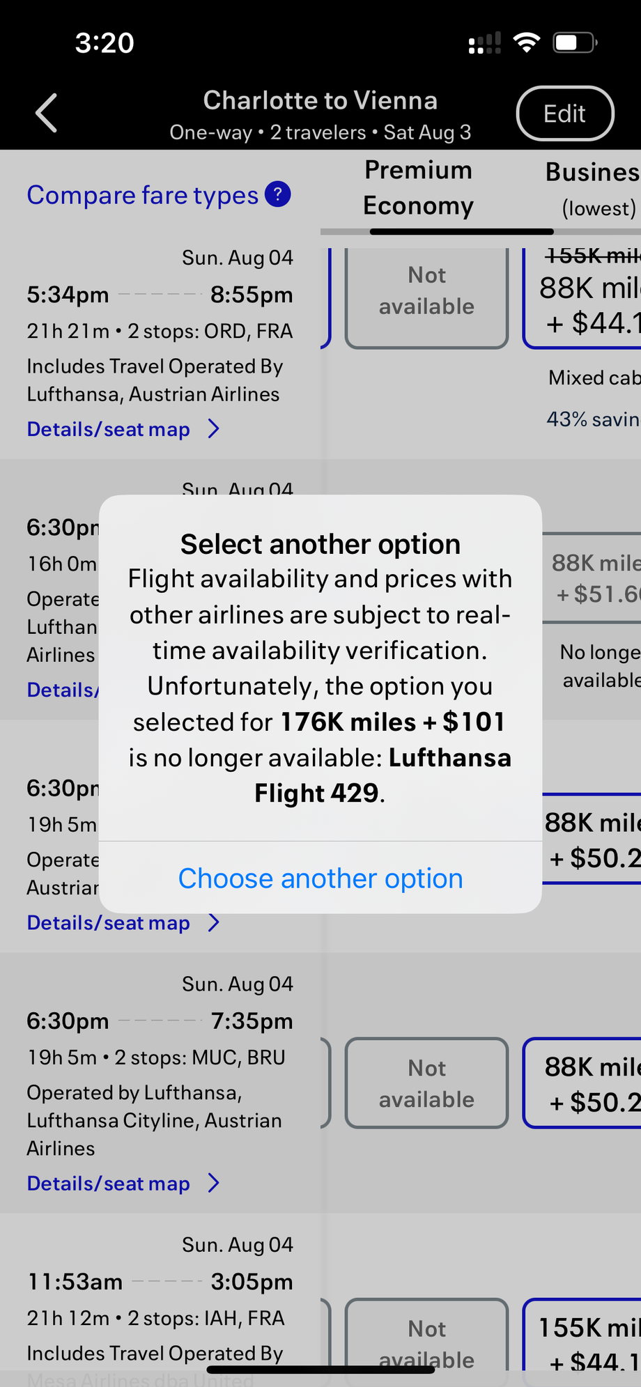Still going on two weeks after that exchange so I called today. (I am semi-flexible on dates and location but we usually fly the 6:30 LH flight out of CLT to MUC for 88K one way in business so that is our preference) . I tell her it is clearly a tech issue on the website or app (I have tried both and used Safari and Chrome). She puts me on hold and first tells me that the "system has been down for a while but all of the business class flights are booked" whatever that means. She then offers me a routing from CLT to SFO to AUK and eventually to BUD for over 500,000 miles. When I ask why she would offer me a flight literally around the world to get to Europe she says "that is the only thing available" which isn't true in the least.