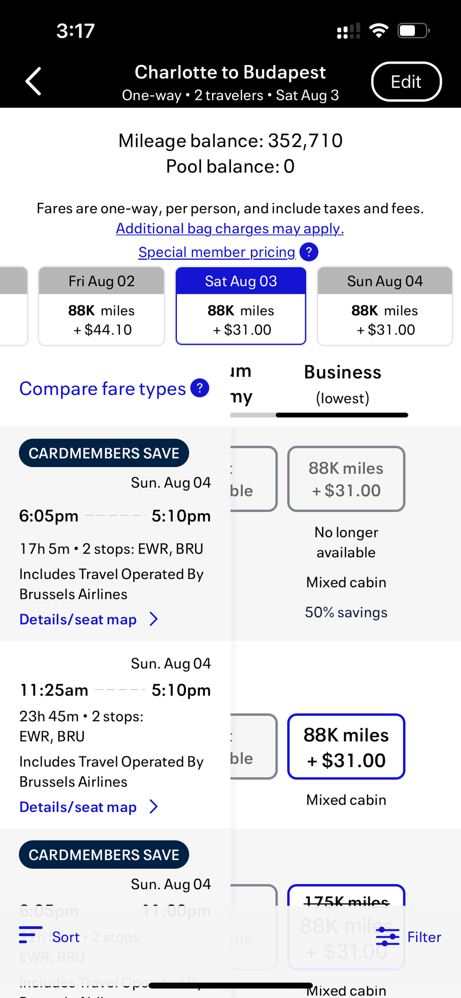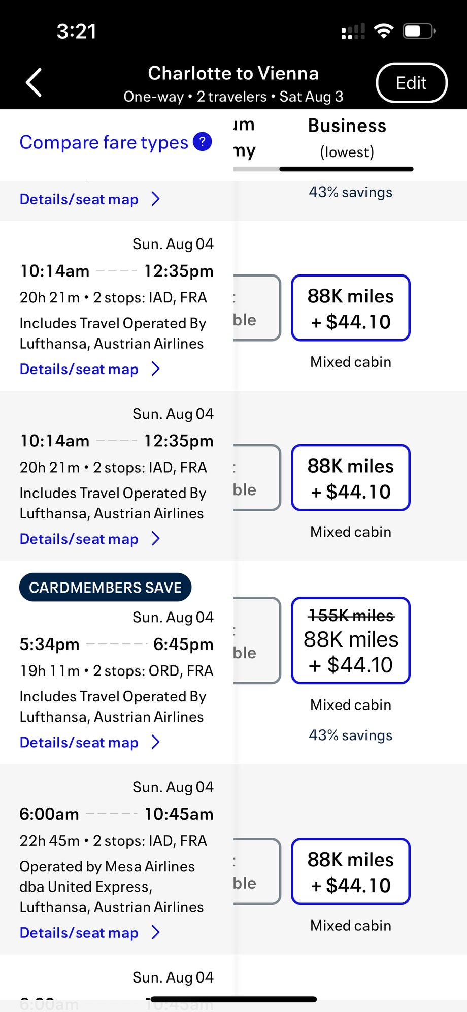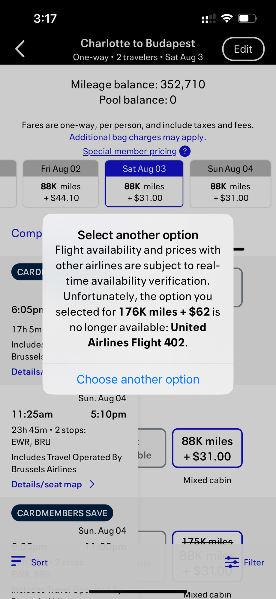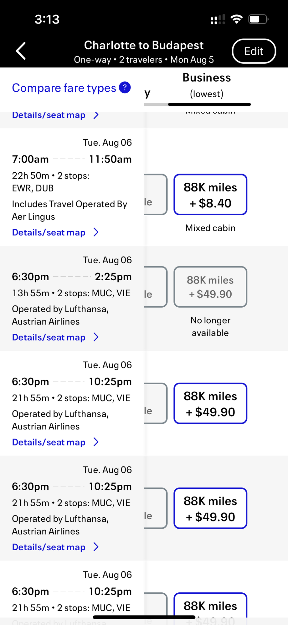 Still going on two weeks after that exchange so I called today. (I am semi-flexible on dates and location but we usually fly the 6:30 LH flight out of CLT to MUC for 88K one way in business so that is our preference) . I tell her it is clearly a tech issue on the website or app (I have tried both and used Safari and Chrome). She puts me on hold and first tells me that the "system has been down for a while but all of the business class flights are booked" whatever that means. She then offers me a routing from CLT to SFO to AUK and eventually to BUD for over 500,000 miles. When I ask why she would offer me a flight literally around the world to get to Europe she says "that is the only thing available" which isn't true in the least.