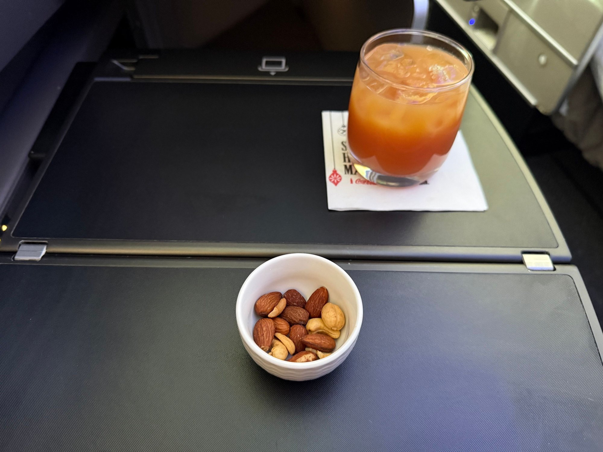 - No table linen. No printed menus, either. Not sure if that's a catering/crew error or if printed menus aren't provisioned on premium transcontinental flights?