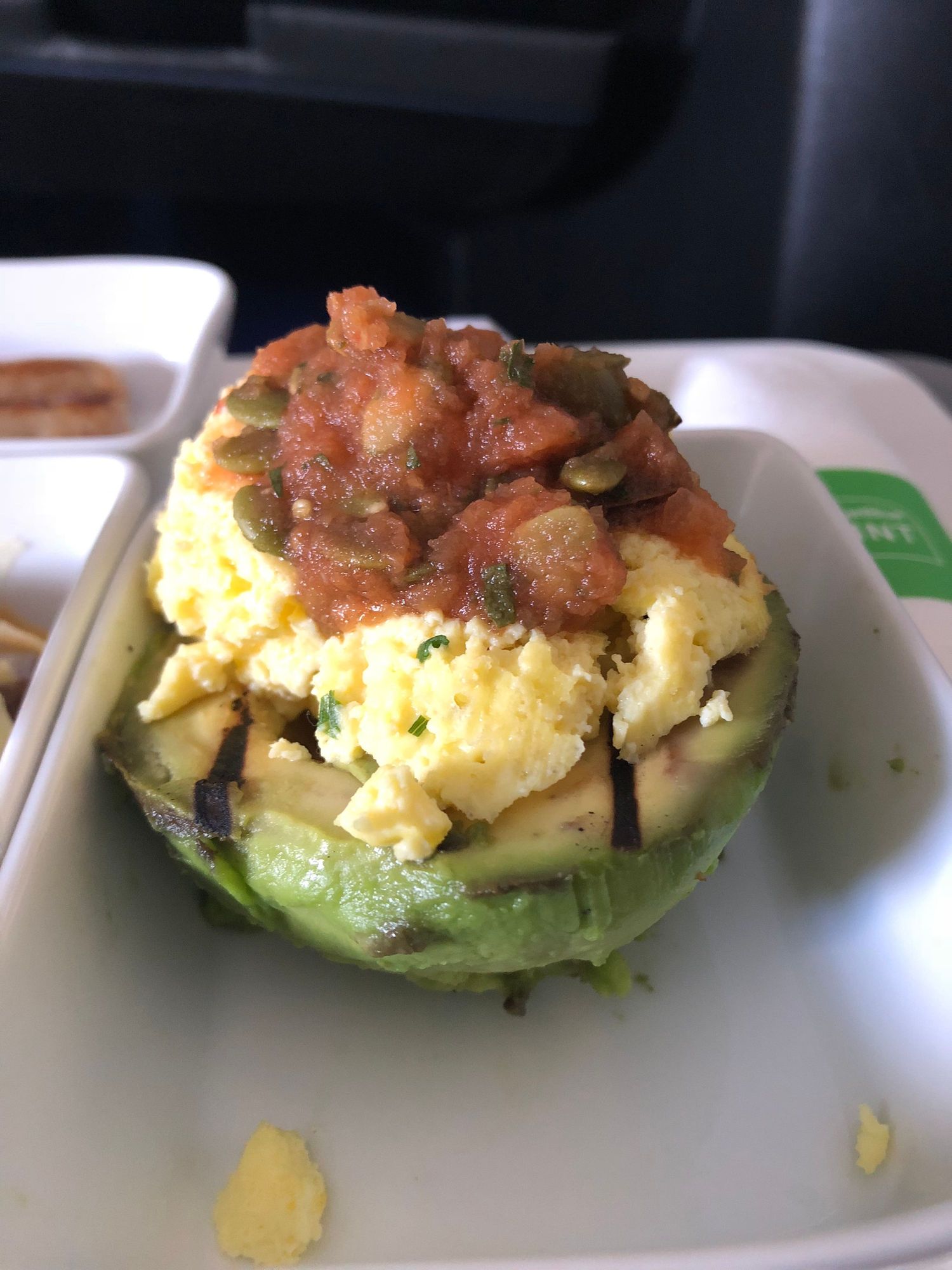 Grilled & chilled avocado - warm scrambled eggs and pepita salsa