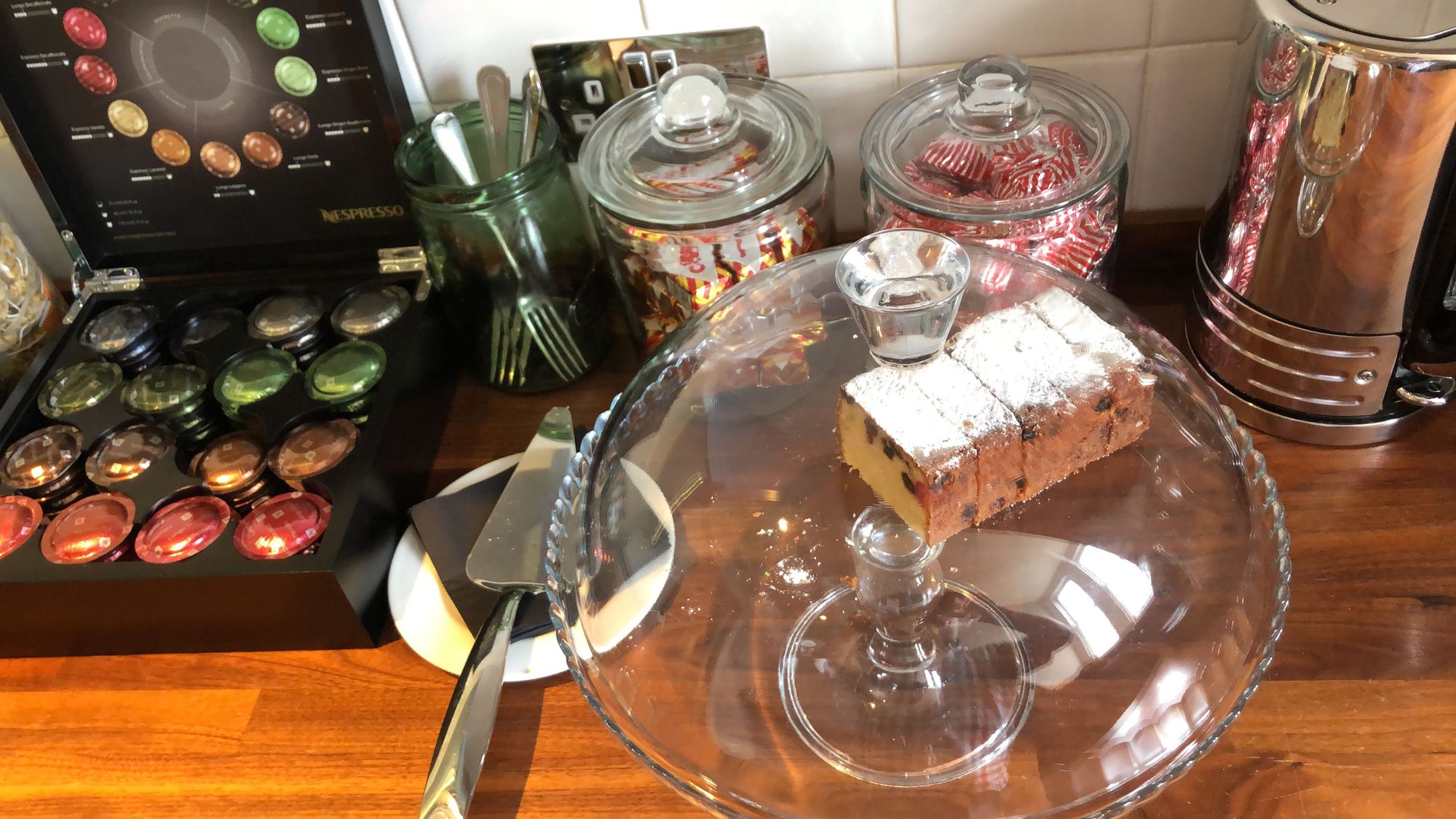 Cake and biscuits with coffee/tea in pantry on each floor.