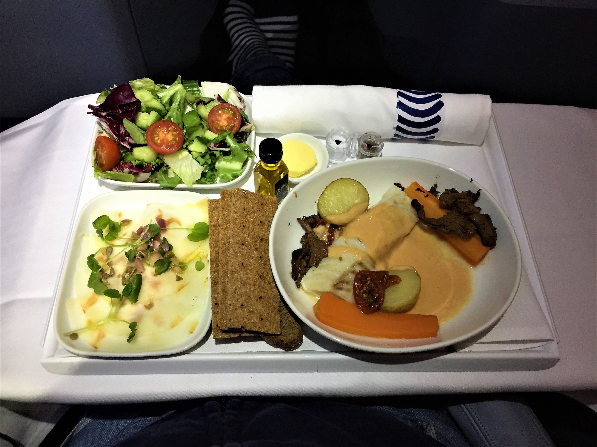 Who in their right mind thinks that one-tray service is fine for 11 hours daytime flight? Appetiser was celery with Västerbotten cheese, main cod with crayfish sauce. Nothing on this tray really impressed me.C