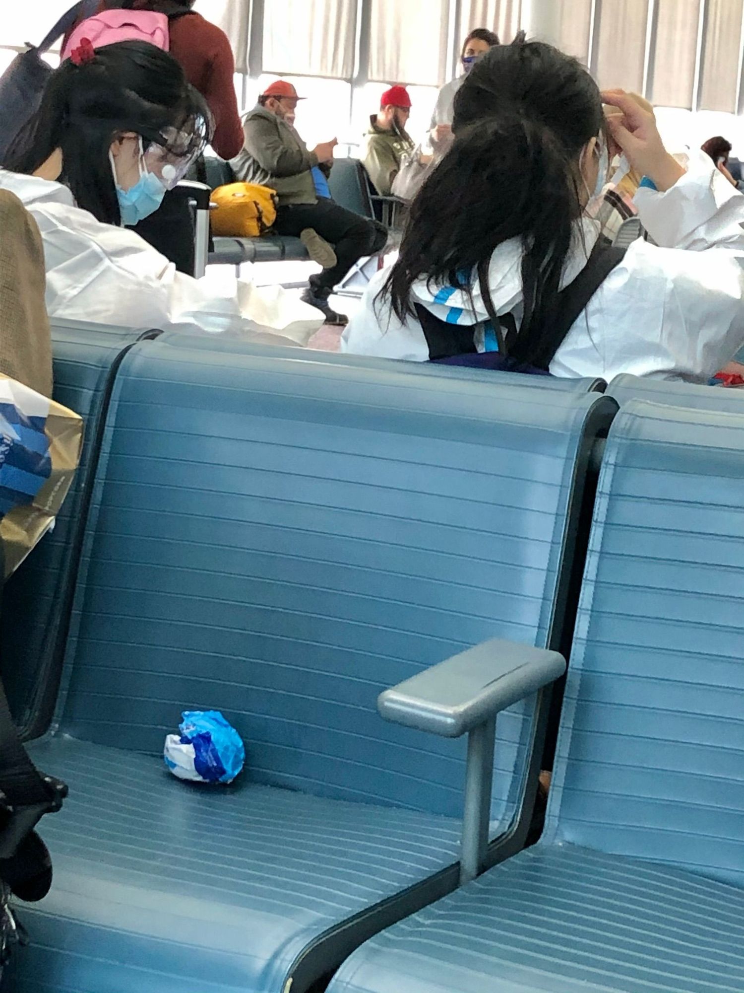 A couple of gals in FULL PPE. Flight 2021 ORD - SFO 737-900 Seat 1E 2:30PM - 5:14PM Skewed 2:25PM - 4:57PM Actual