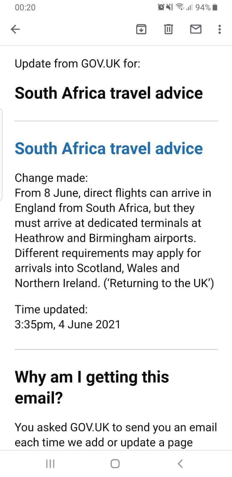 Hello all - for those still subscribed to this thread, UKGOV have just updated their travel advice to allow direct flights from SA to the UK - SA is (presumably) staying on the red list and passengers will still have to go through mandatory quarantine. I’m currently in day 4 of quarantine at Heathrow - I’m hoping this news means I can fly back to SA direct later in the summer (rather than the 21 hour circus through Doha and Madrid to get here). ​​​​​​​