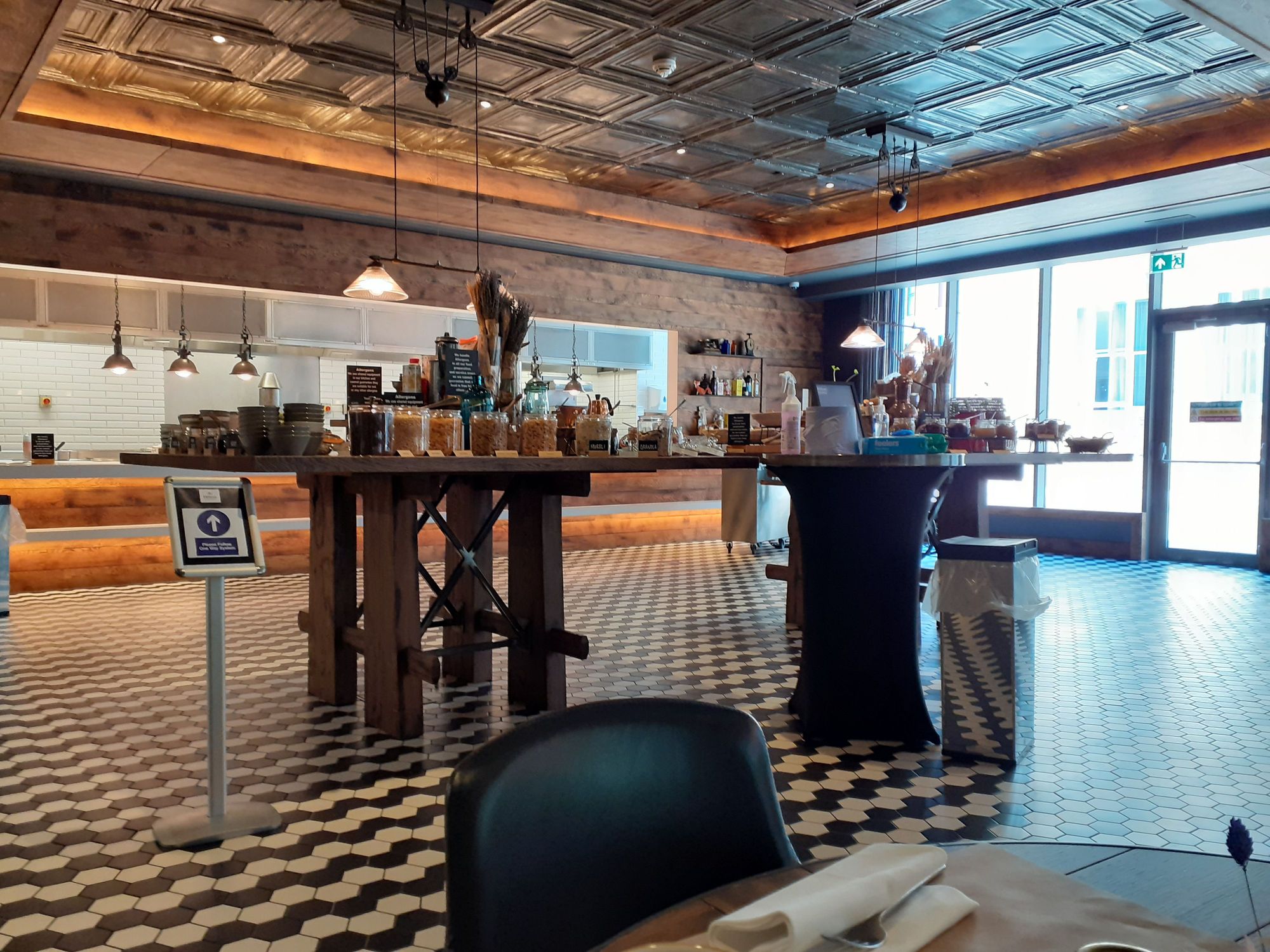 Cereal and pastry stations ( plus Haribo). Hot food serving area at the back